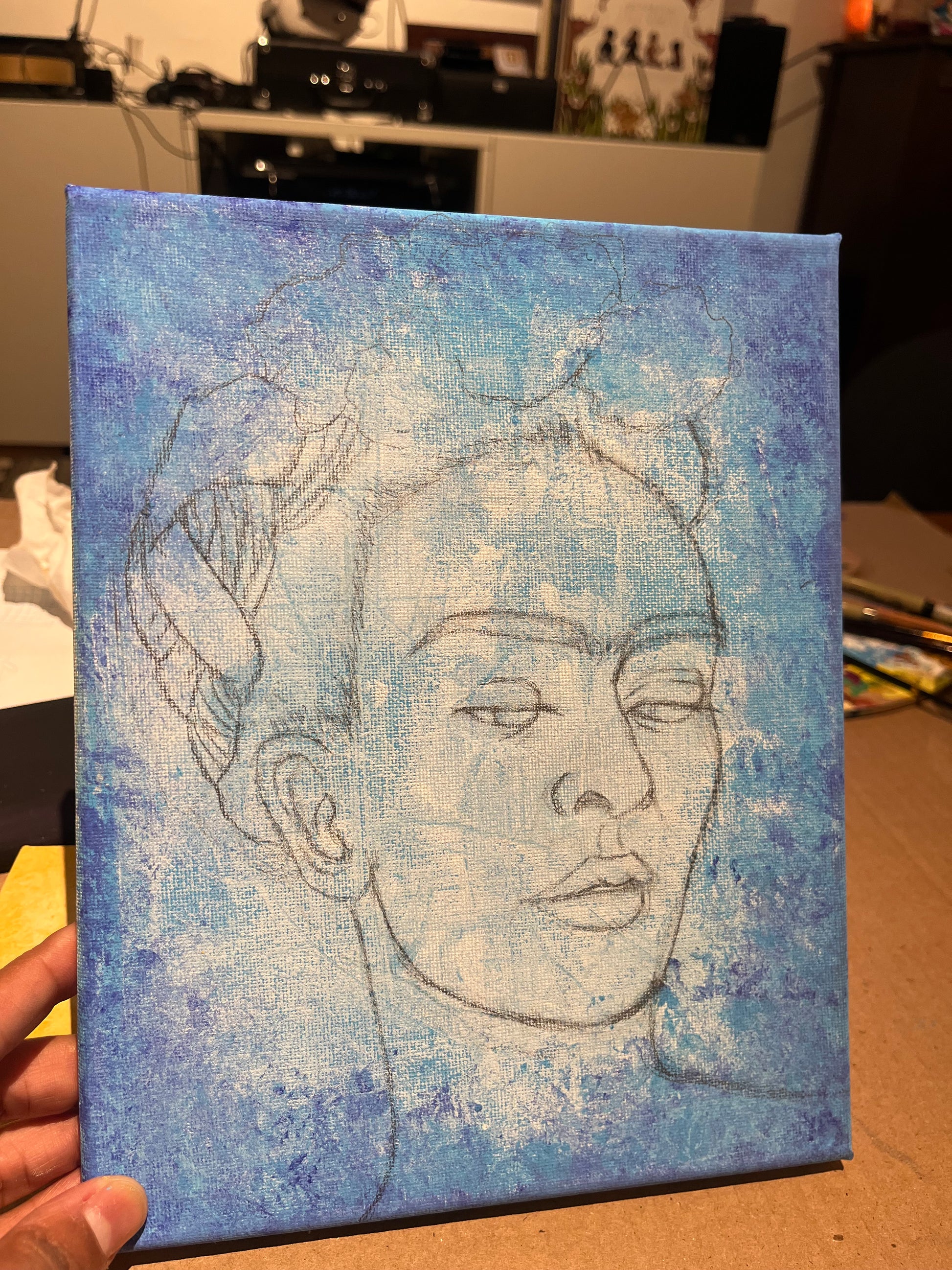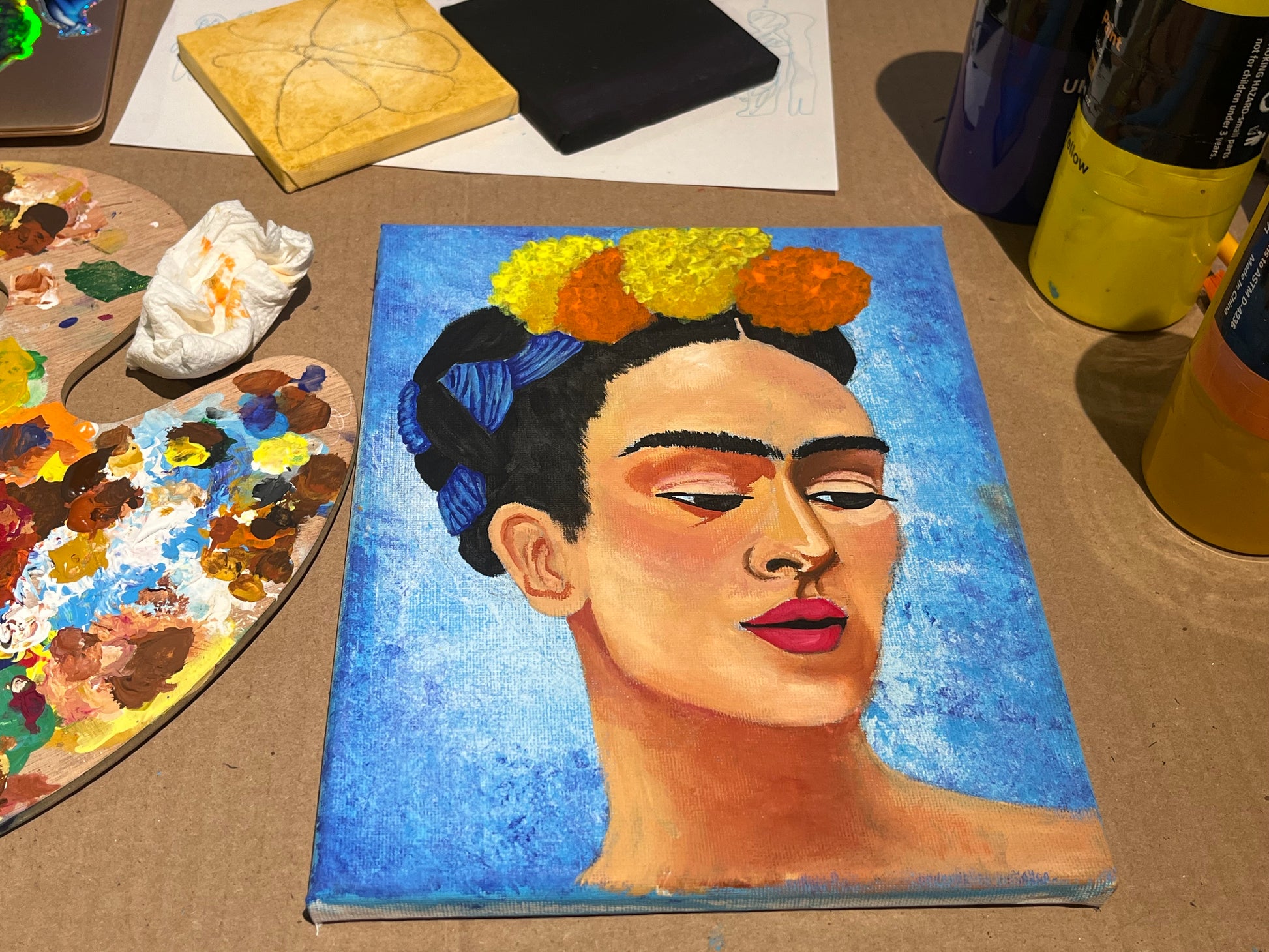 Souls in Flight, or Almas en Vuelo, is my little love letter to a beloved muse. This is one of my smaller pieces that I could work on in my comfy corner, with a cup of tea nearby and a blanket on my lap. I imagined Frida, her vivid life, innumerable struggles, and immense talent and vision.