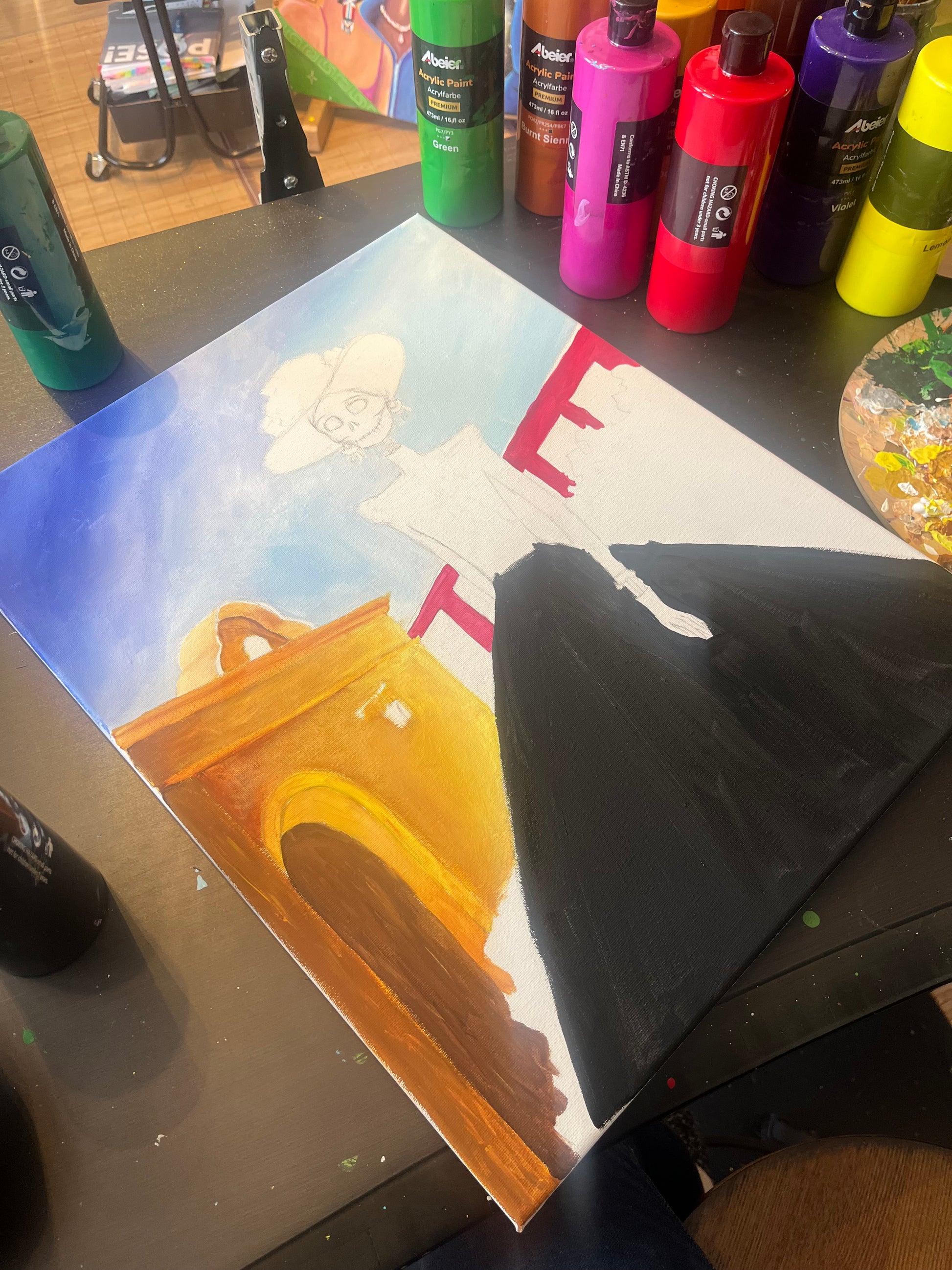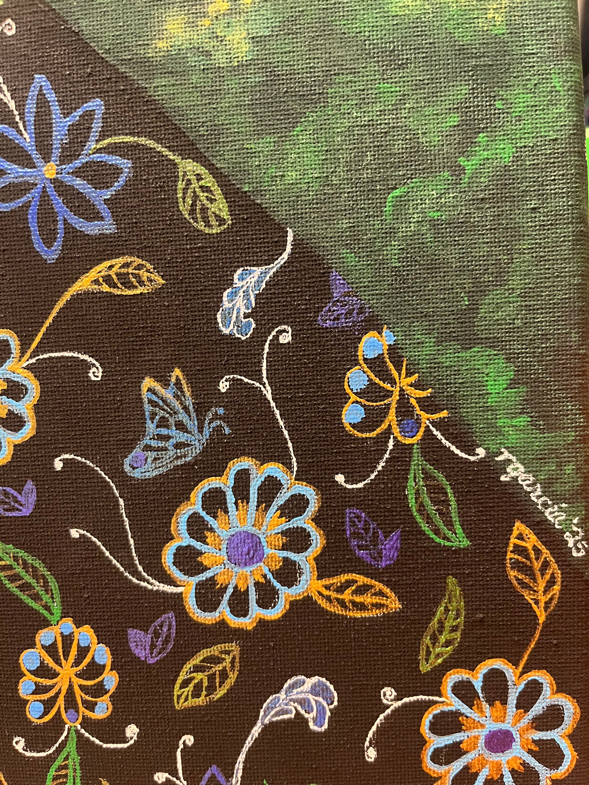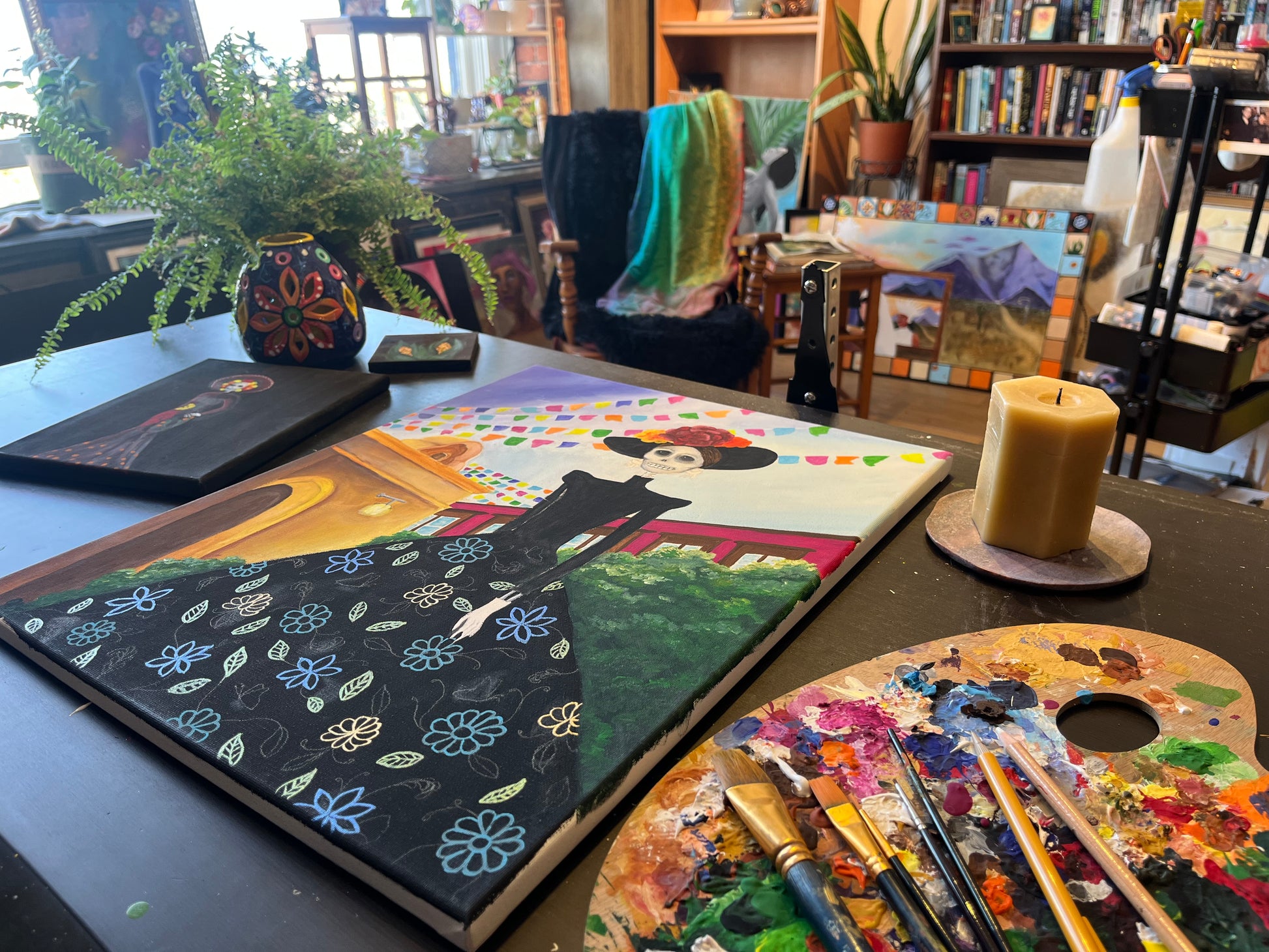 Dia de Muertos, or Day of the Dead, is a time for remembering and celebration; for laughter, music, food, and inviting in the memories of those who have gone on before us. The chilly days, with the sun slanting down on my canvas were perfect for the hours spent thinking of friends and family on the other side; for letting the brush bring to life a colorful scene that invites you to remember with me, laugh with me, celebrate life and memory.