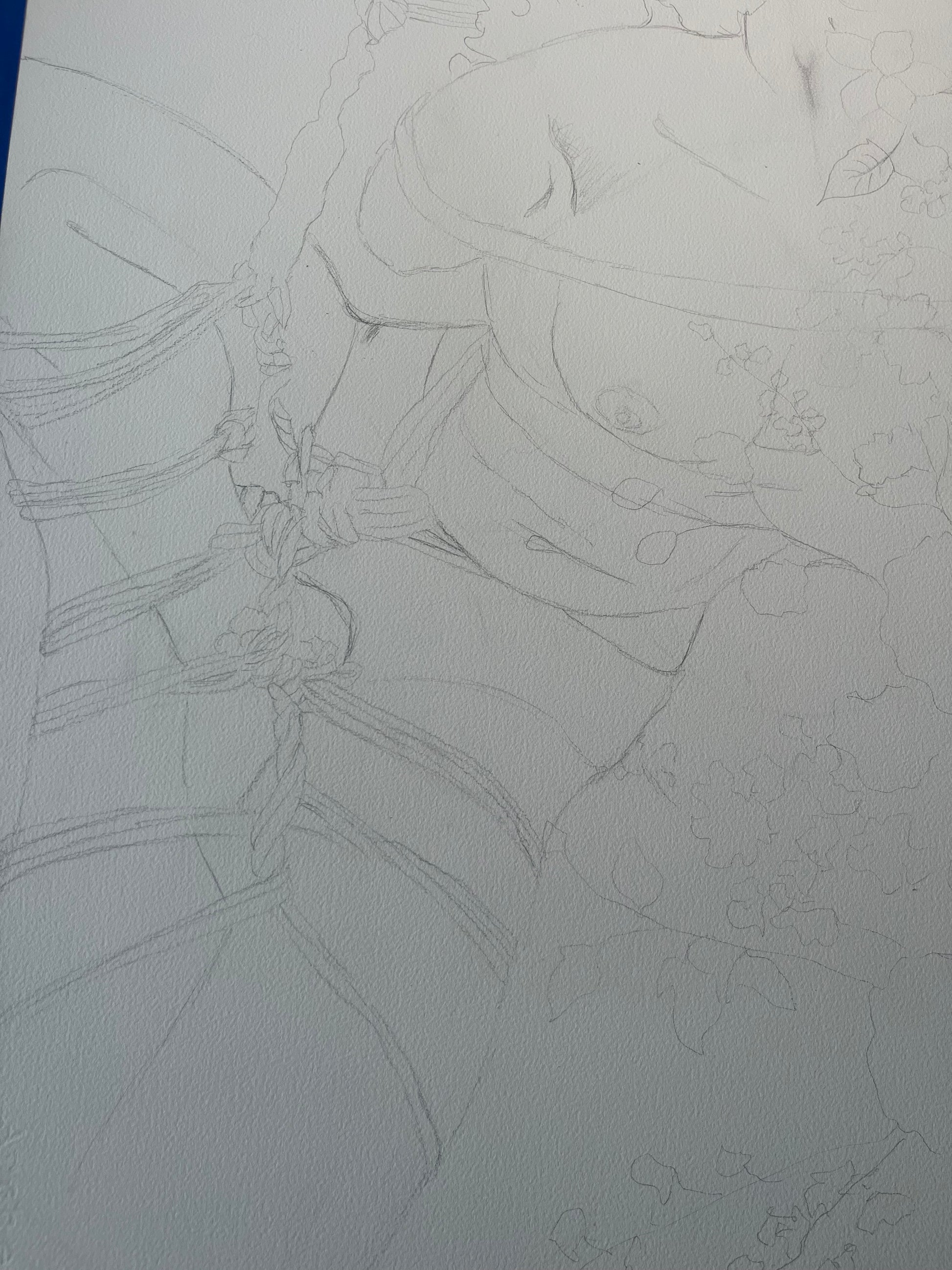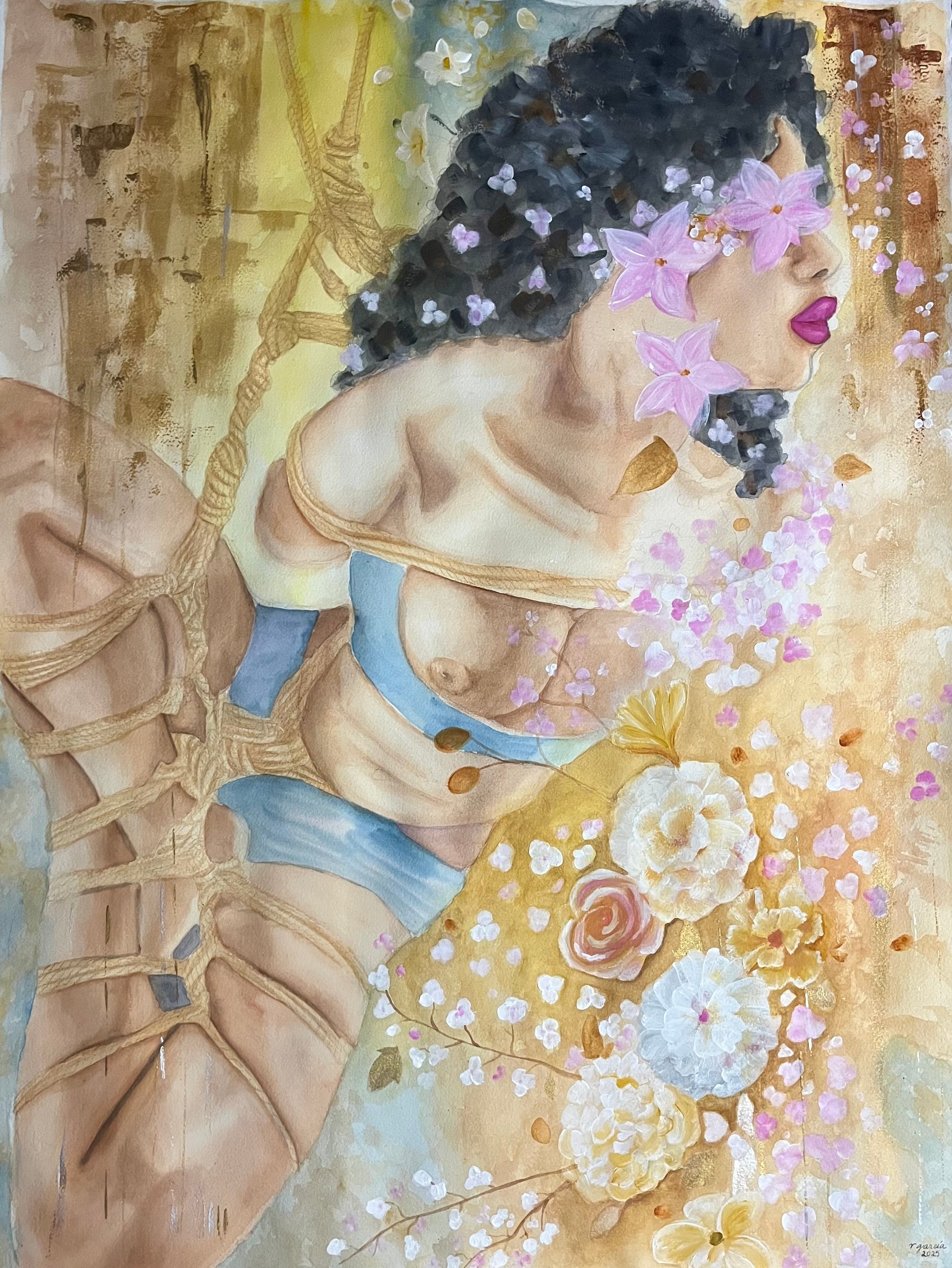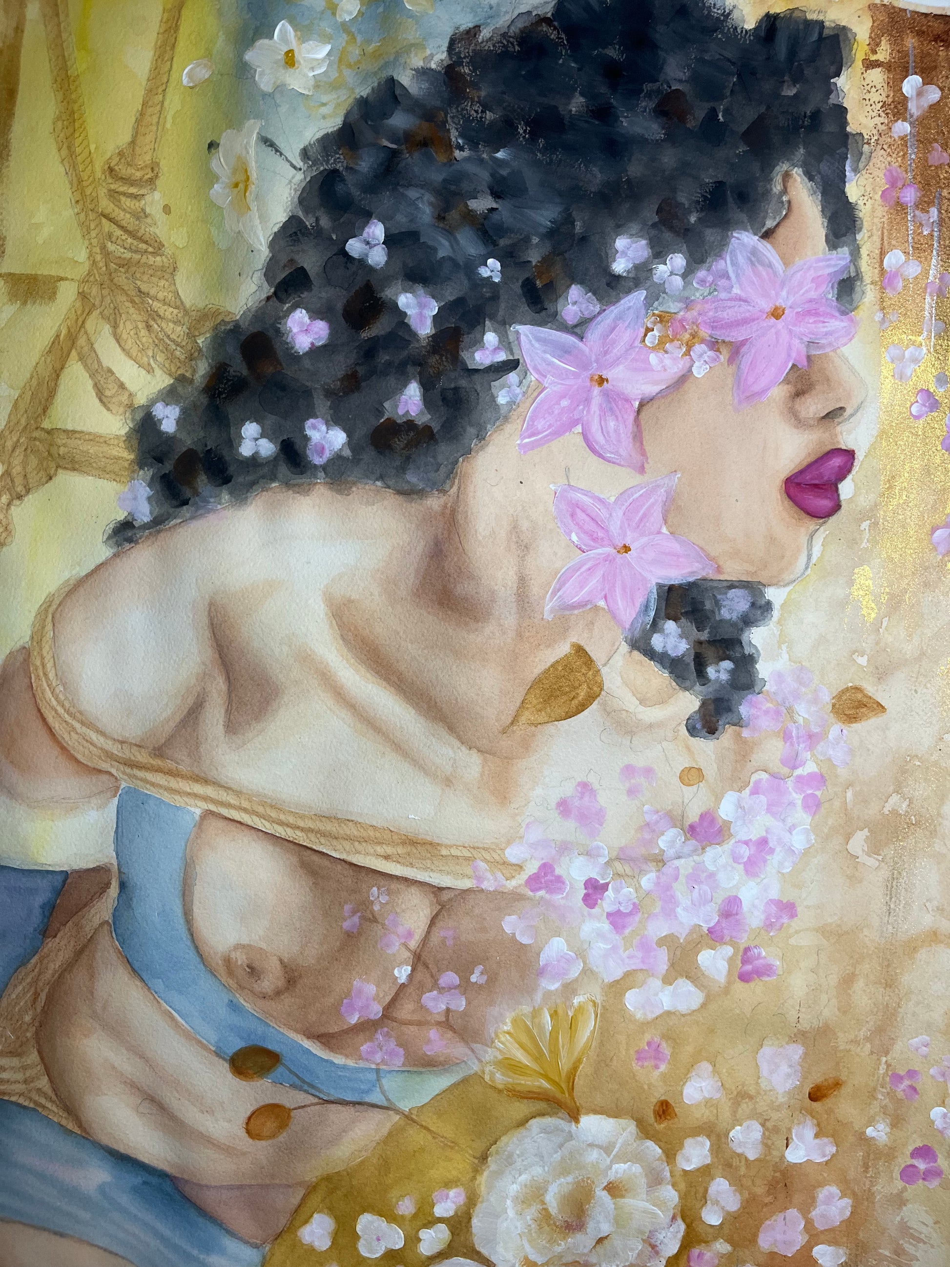 I often liken the practice of shibari to meditation. For me, the Japanese art of rope bondage is a way to experience closeness, push one's limits physically and mentally- safely, and artistically. And to reach a state where the mind is free and weightless. I was very excited to try my hand at a larger watercolor of a shibari piece and was so happy with how it turned out. The lightness of the colors reflect the lightness of being that one can experience in rope.
