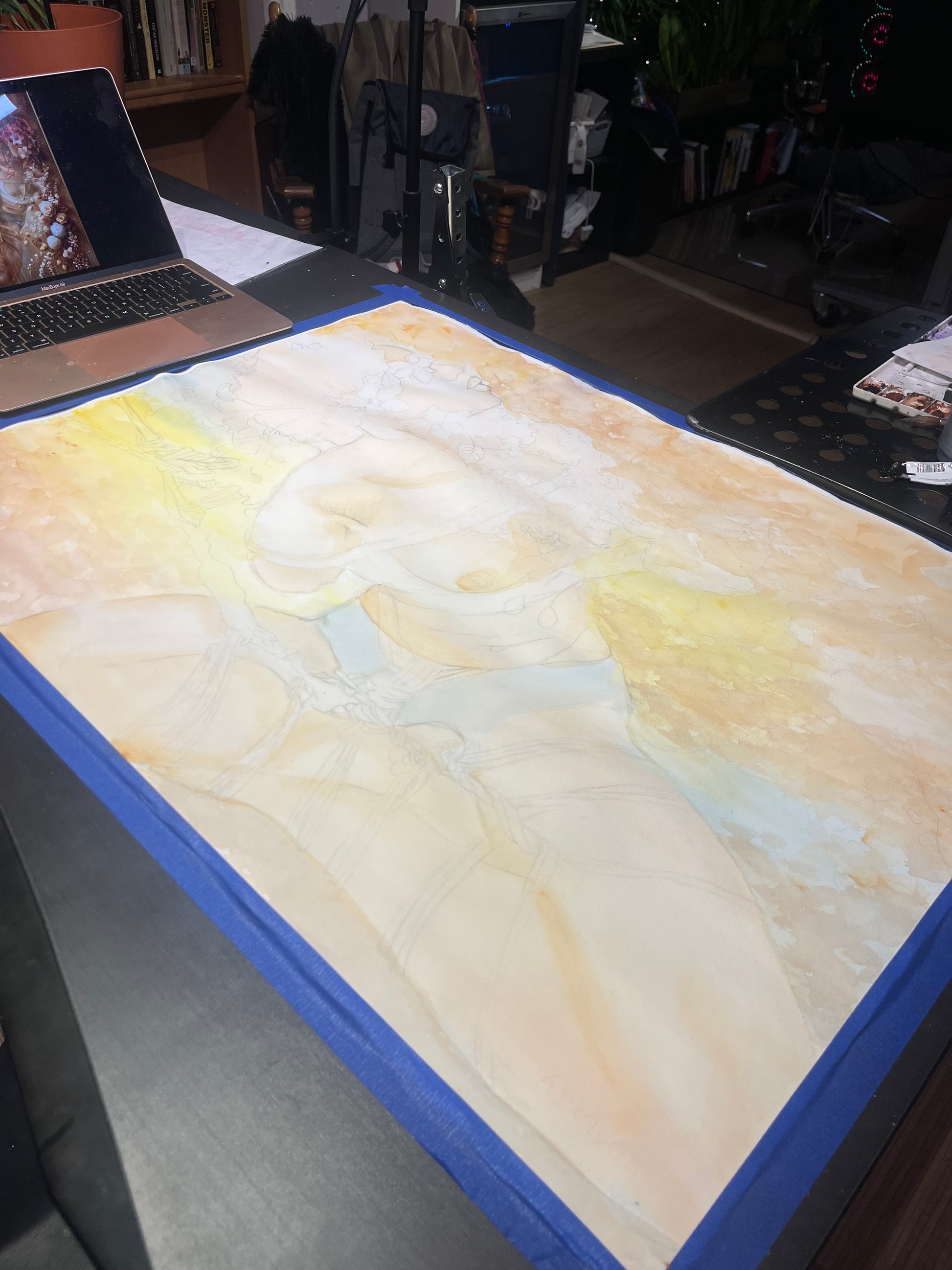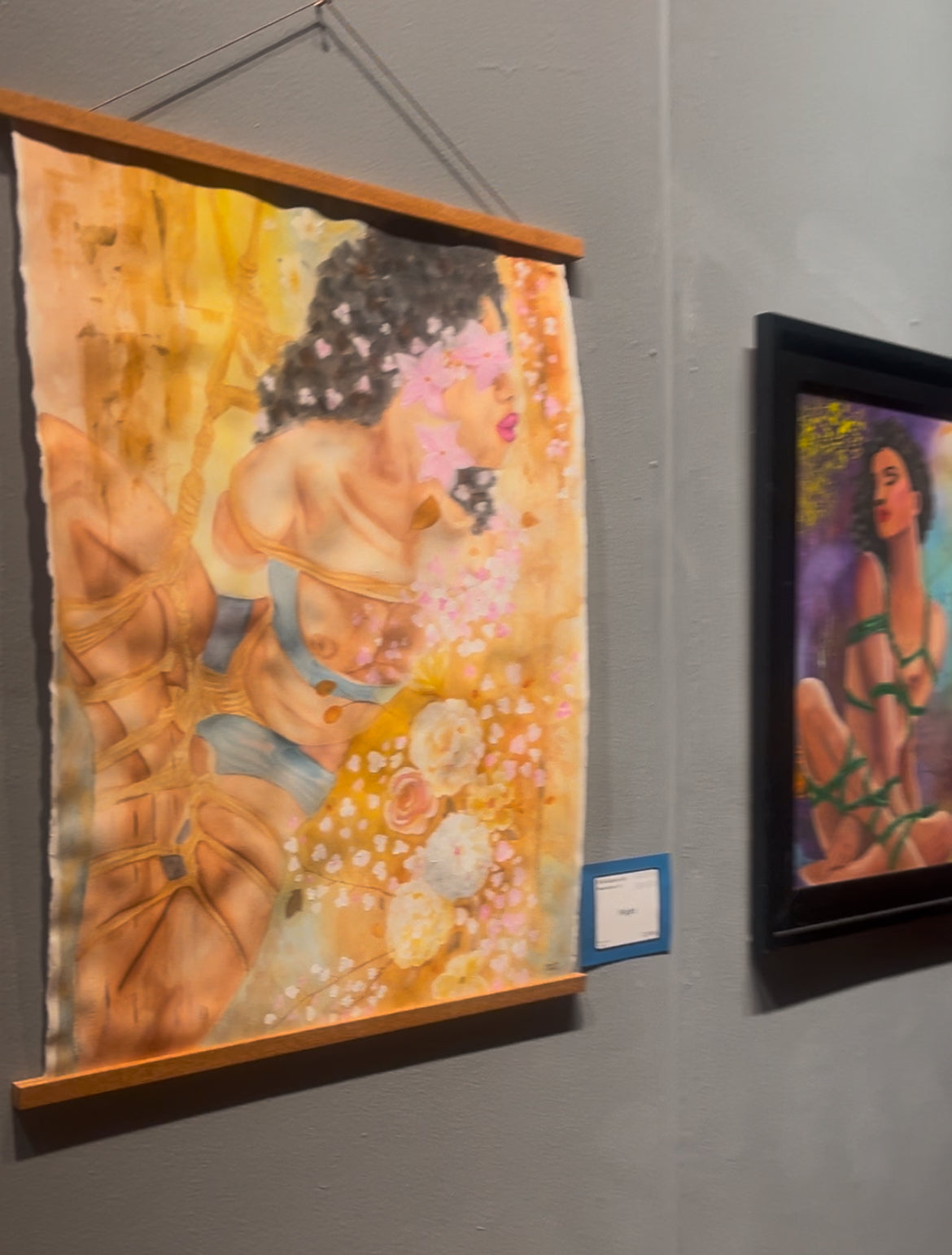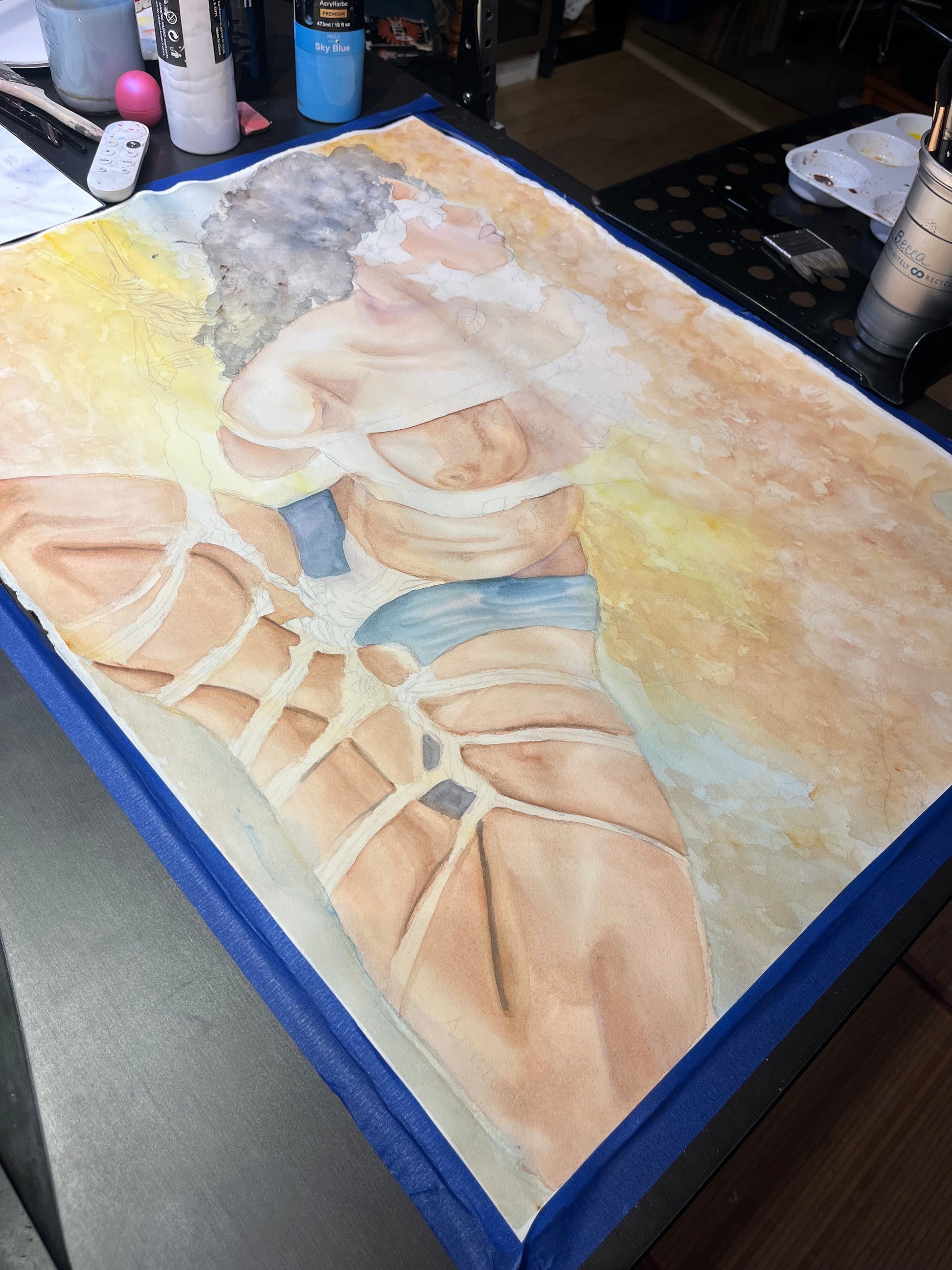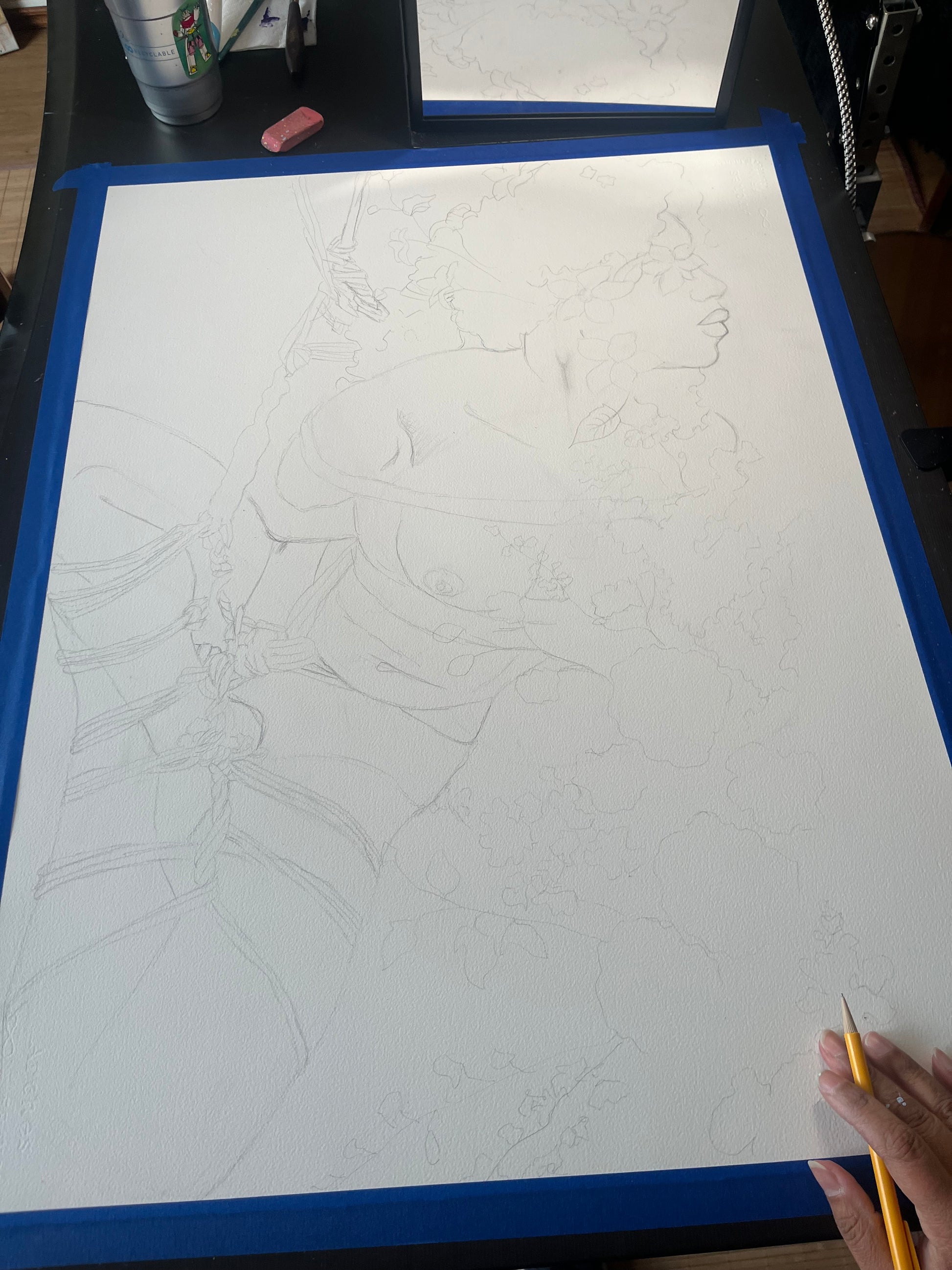 I often liken the practice of shibari to meditation. For me, the Japanese art of rope bondage is a way to experience closeness, push one's limits physically and mentally- safely, and artistically. And to reach a state where the mind is free and weightless. I was very excited to try my hand at a larger watercolor of a shibari piece and was so happy with how it turned out. The lightness of the colors reflect the lightness of being that one can experience in rope.