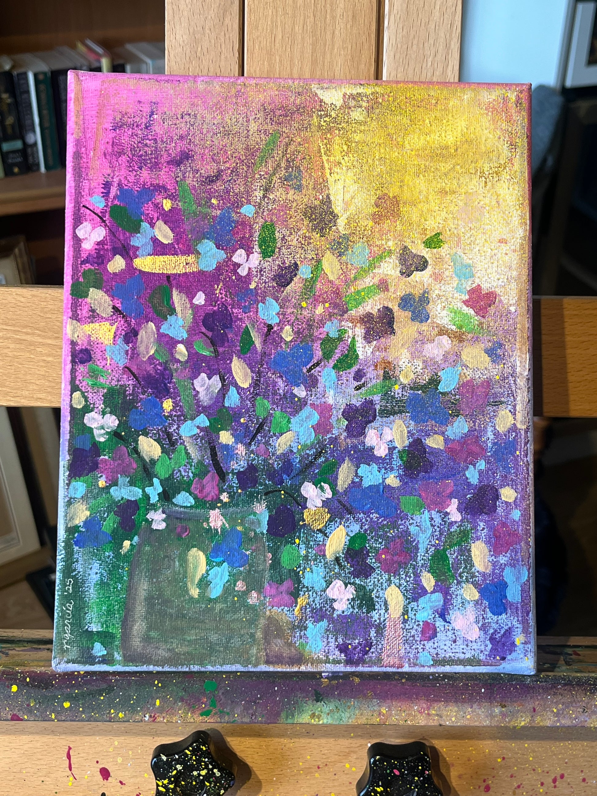 I created this small piece to remind me of the coming days of sun and, being in the PNW, the rain, and with them- spring's blooms.