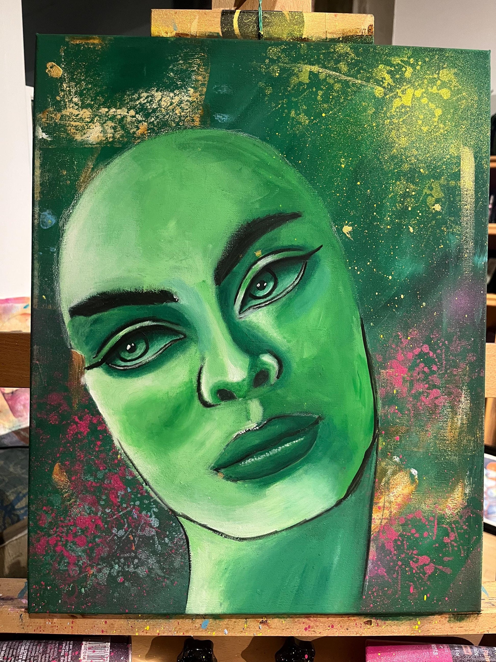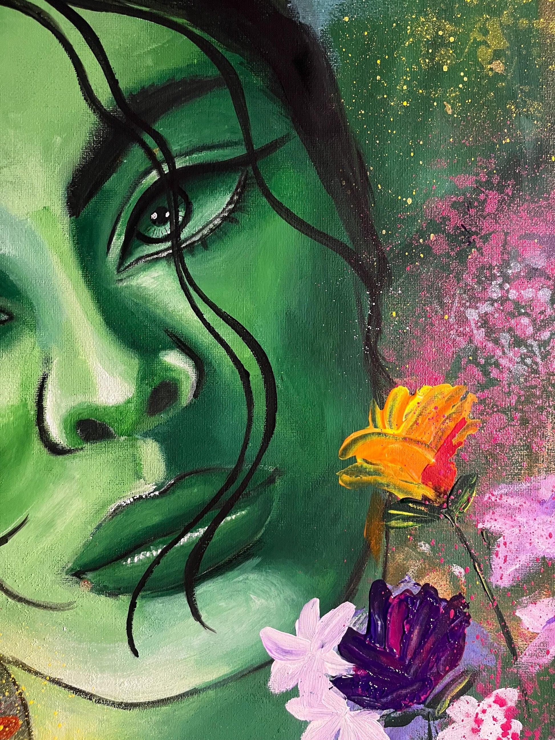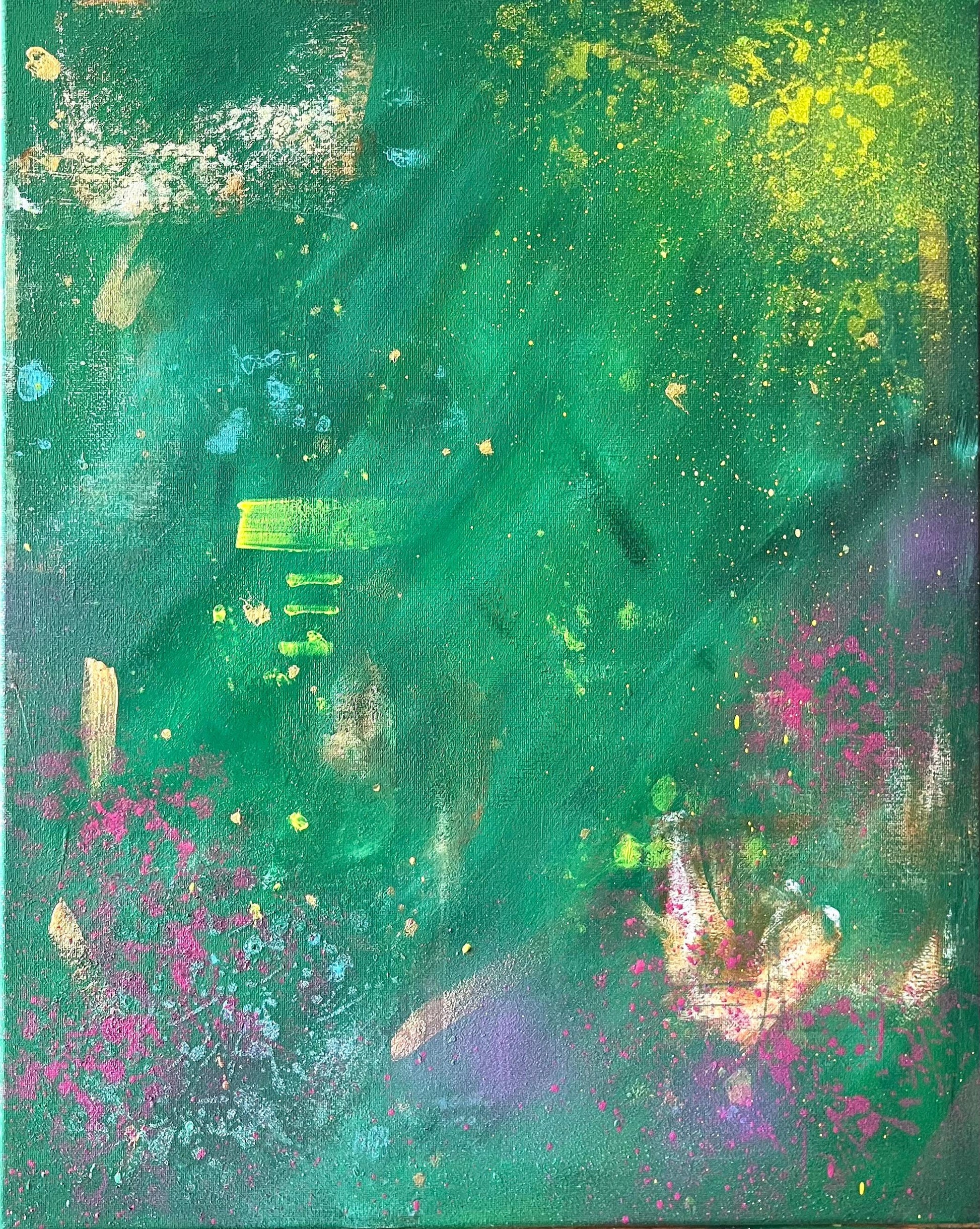 Hand-made 16x20 acrylic painting. Working on this painting was so freeing: from spray painting, to brush strokes; palette knife work and stenciling; rollers to metallic acrylic splatters. I loved bringing her to life and hope she brings life to your space!
