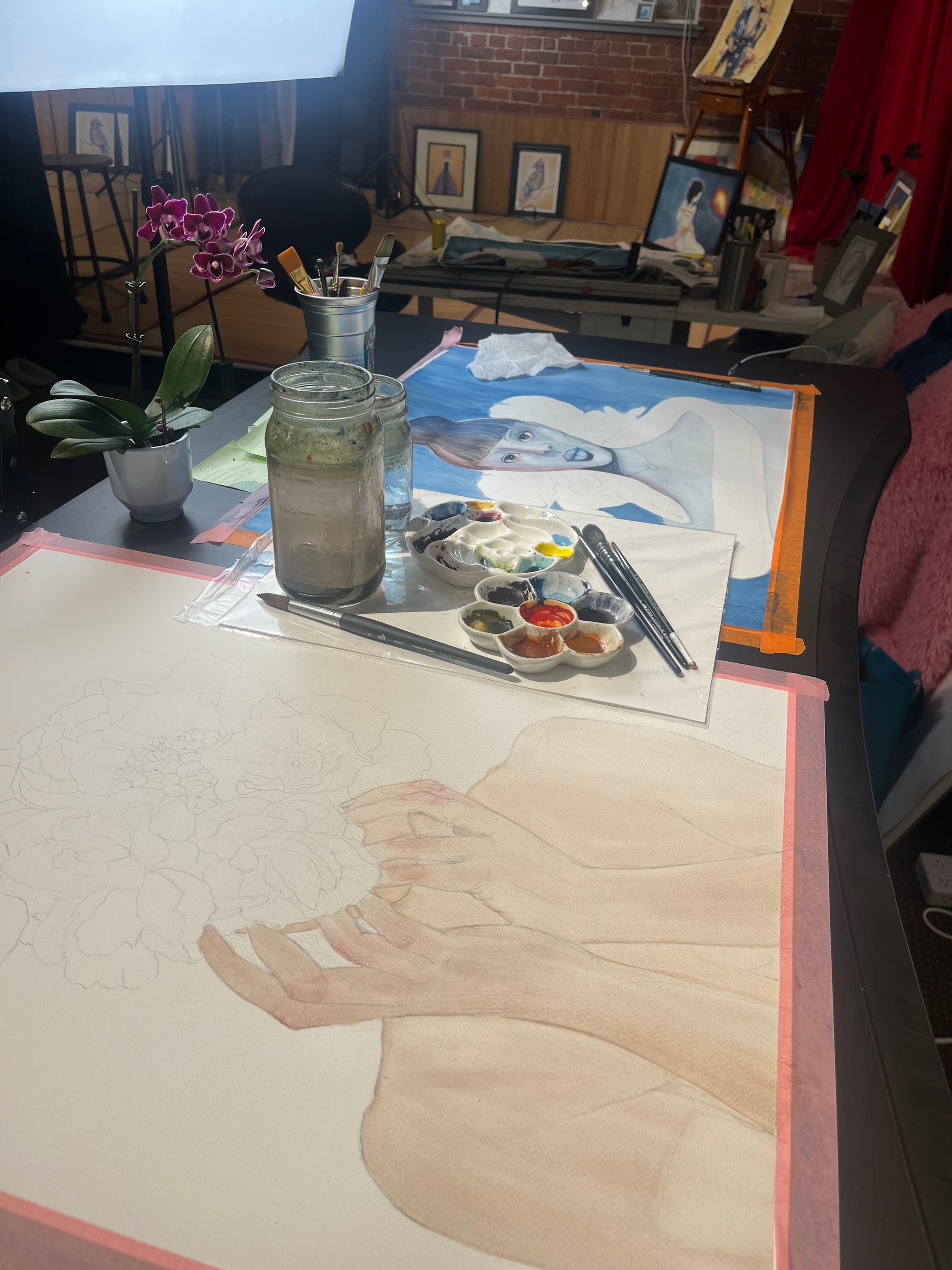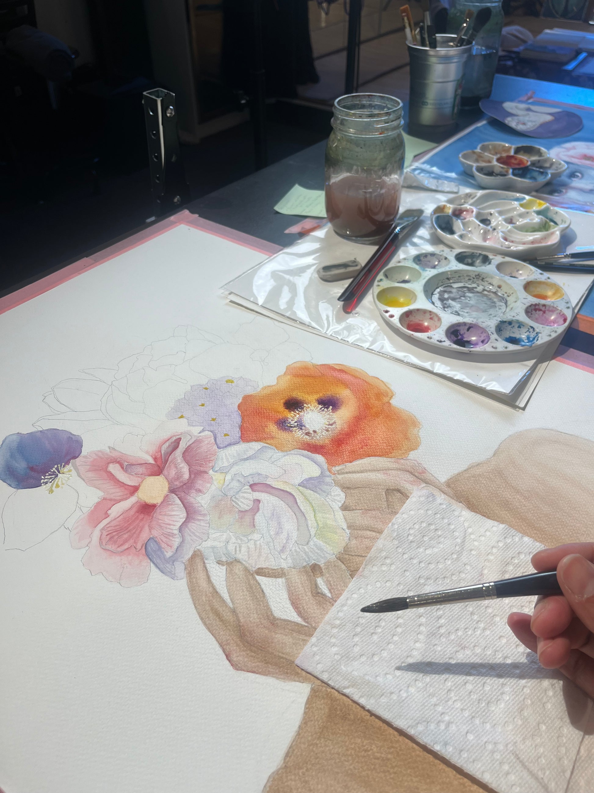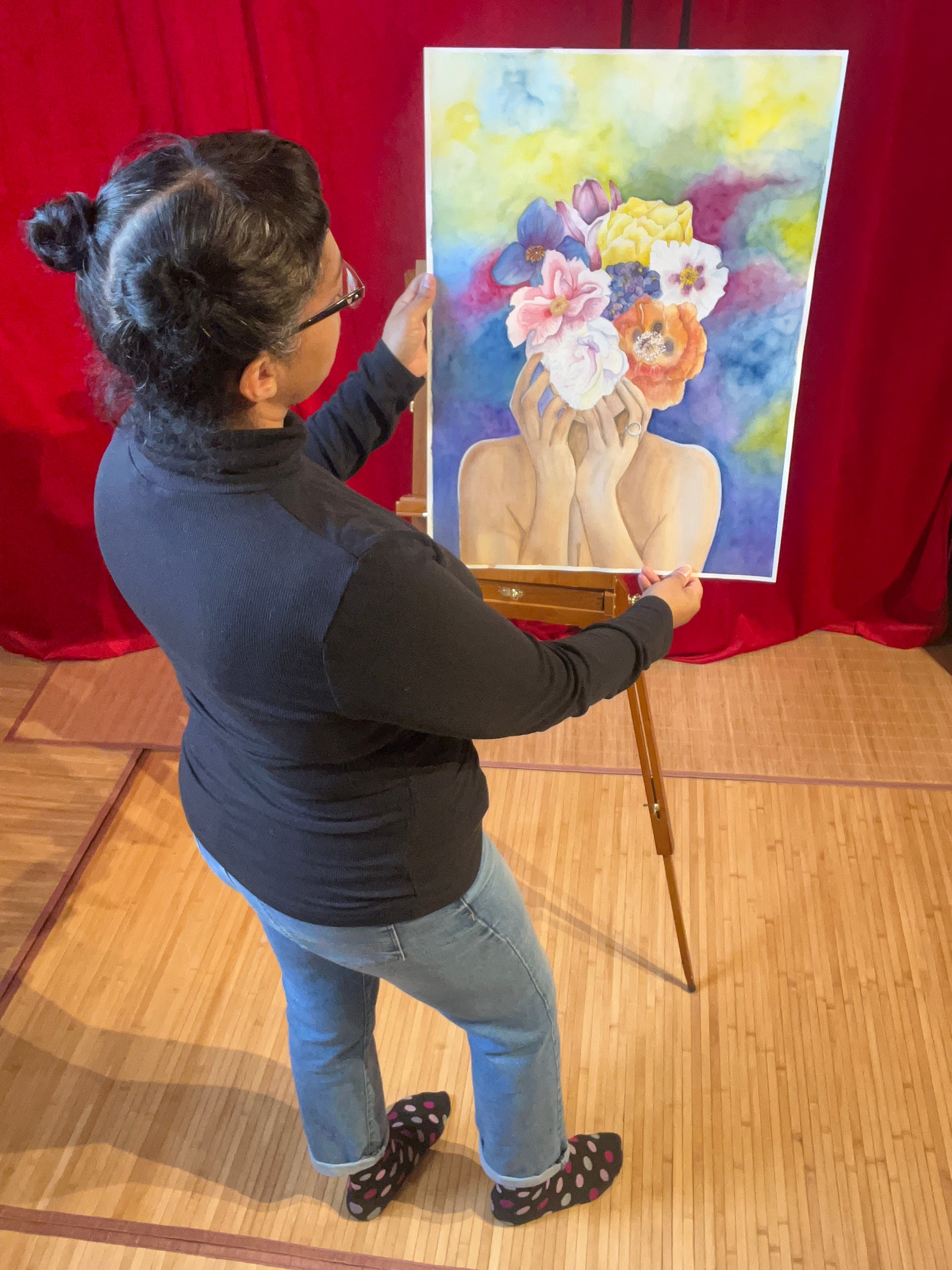A riot of color, she holds in her hands the blooms that she emulates: slowly unfolding, becoming. Watercolor. 18x24. 2024.