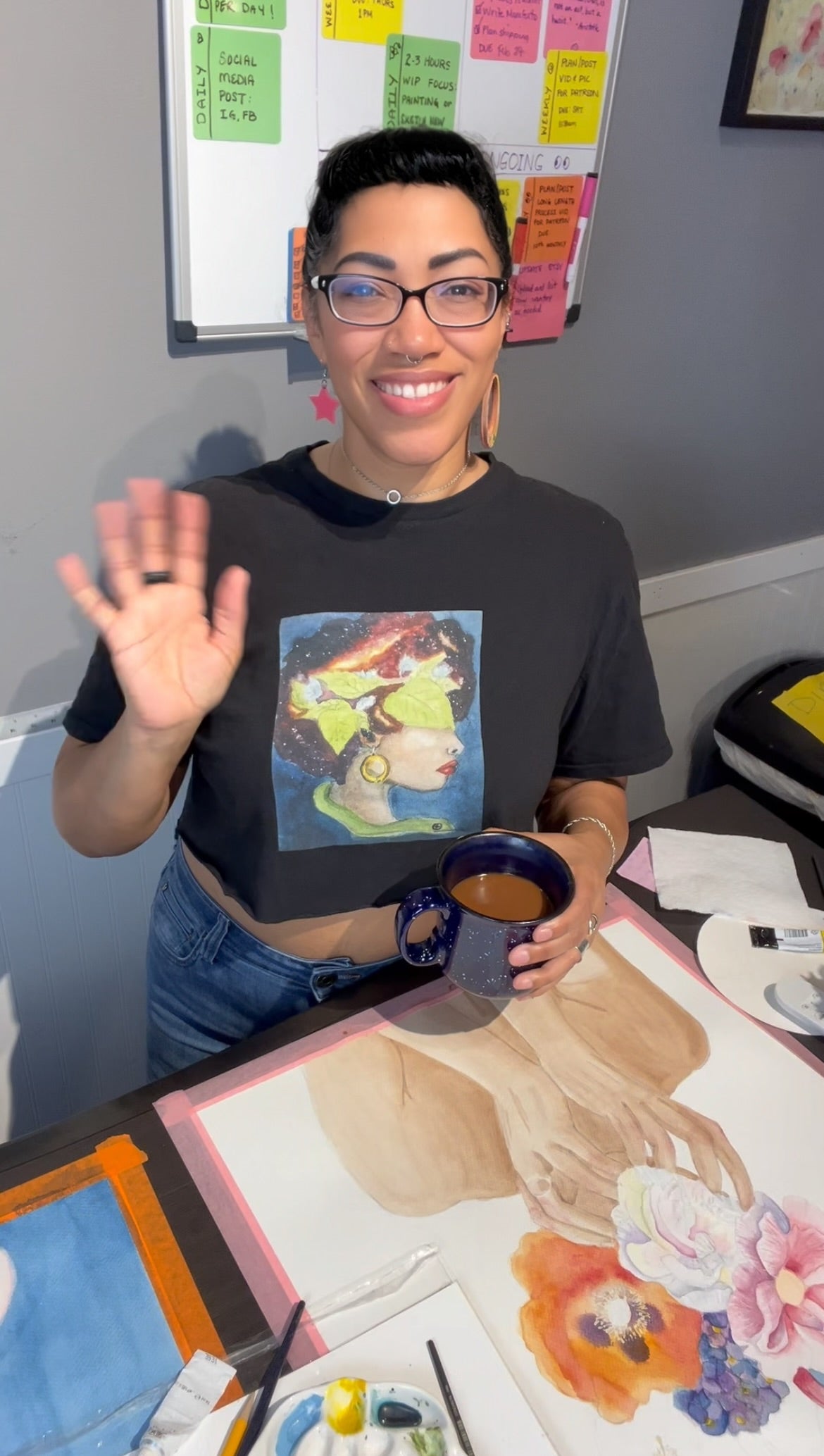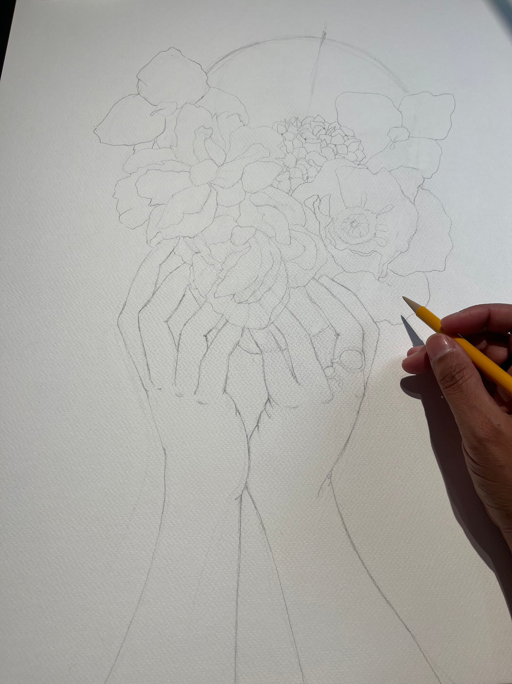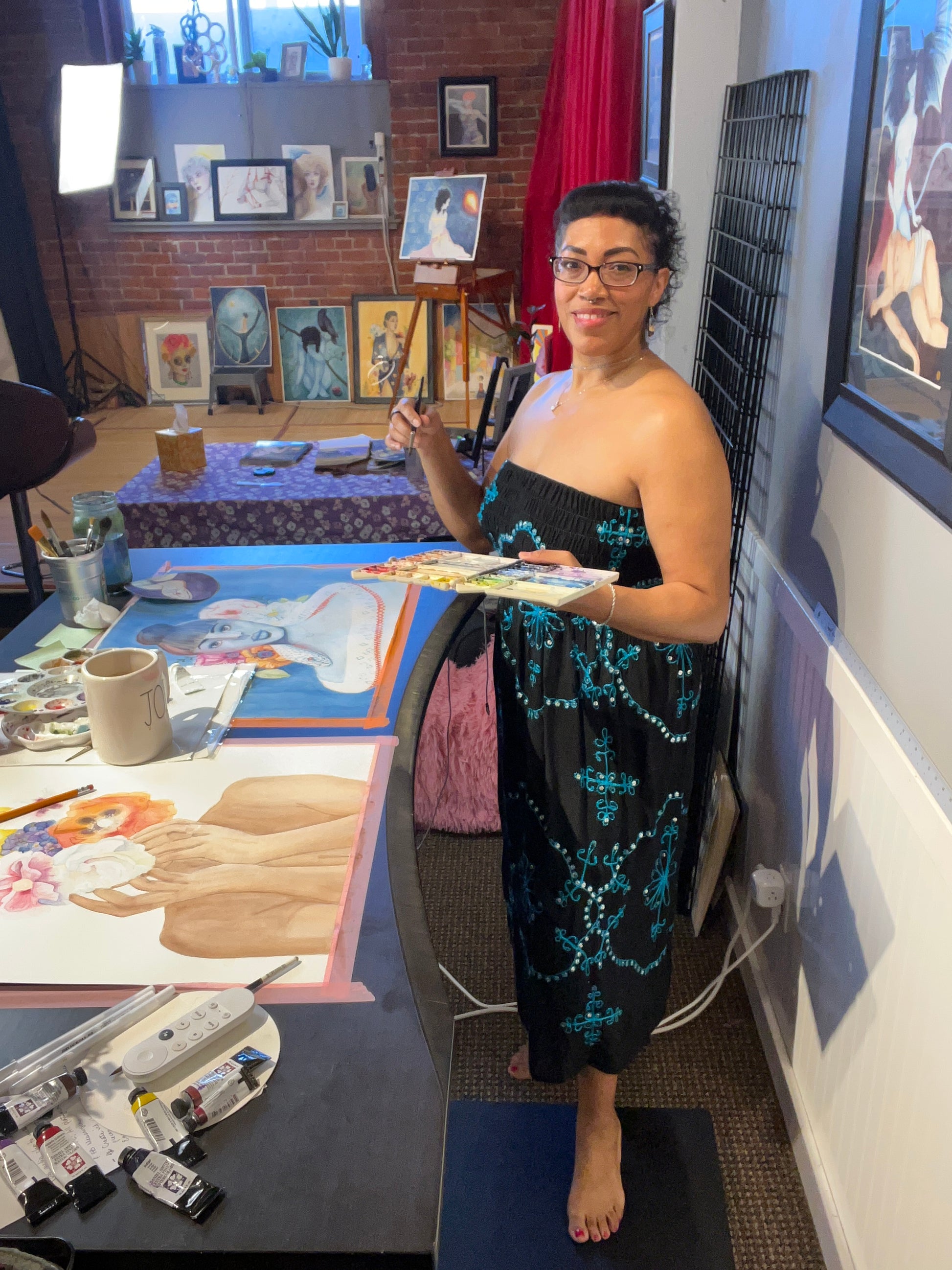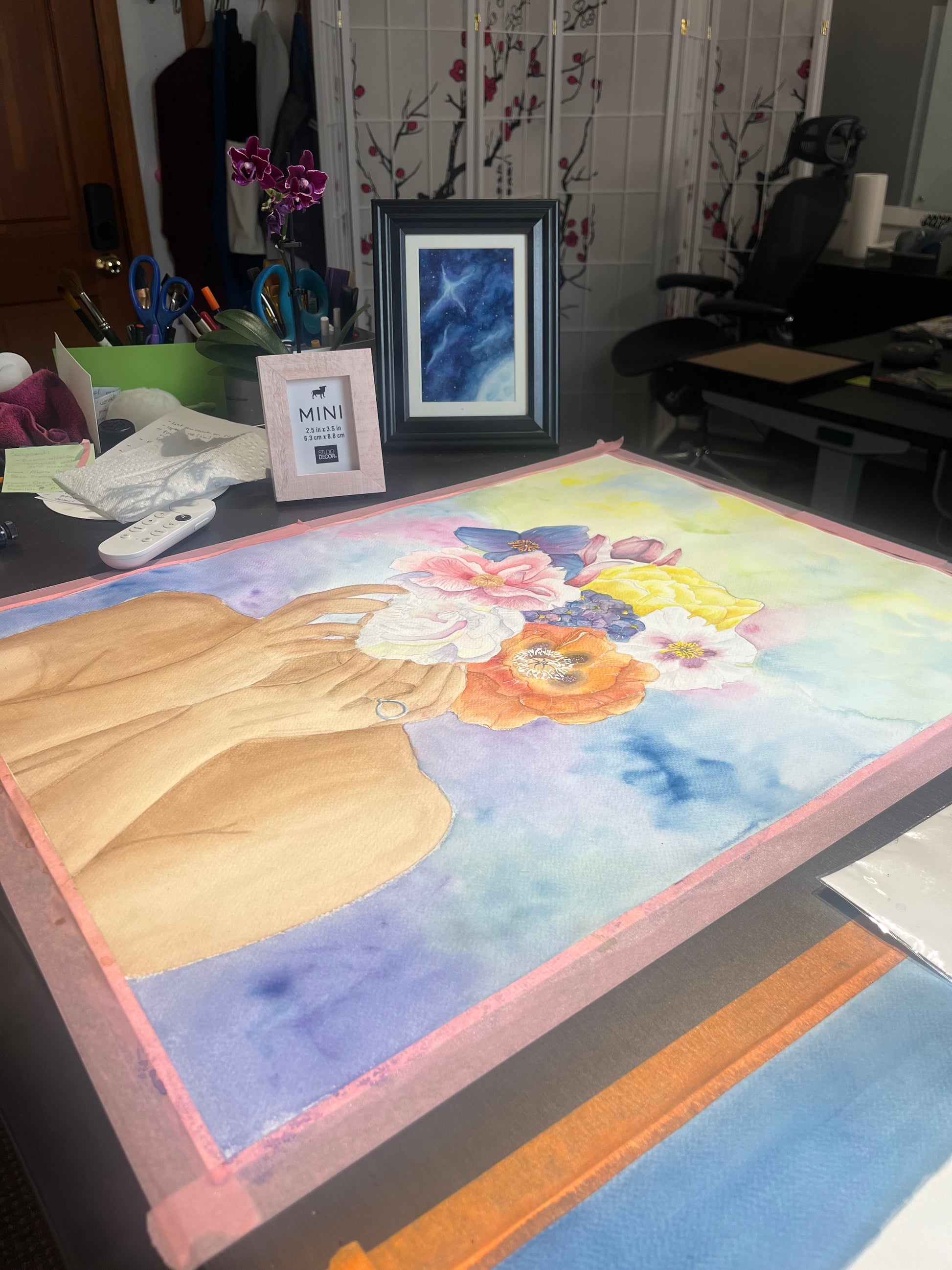 A riot of color, she holds in her hands the blooms that she emulates: slowly unfolding, becoming. Watercolor. 18x24. 2024.