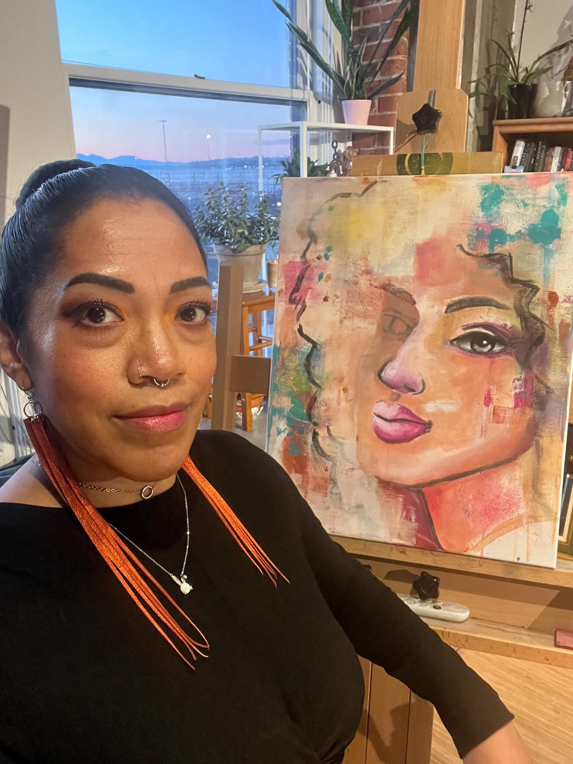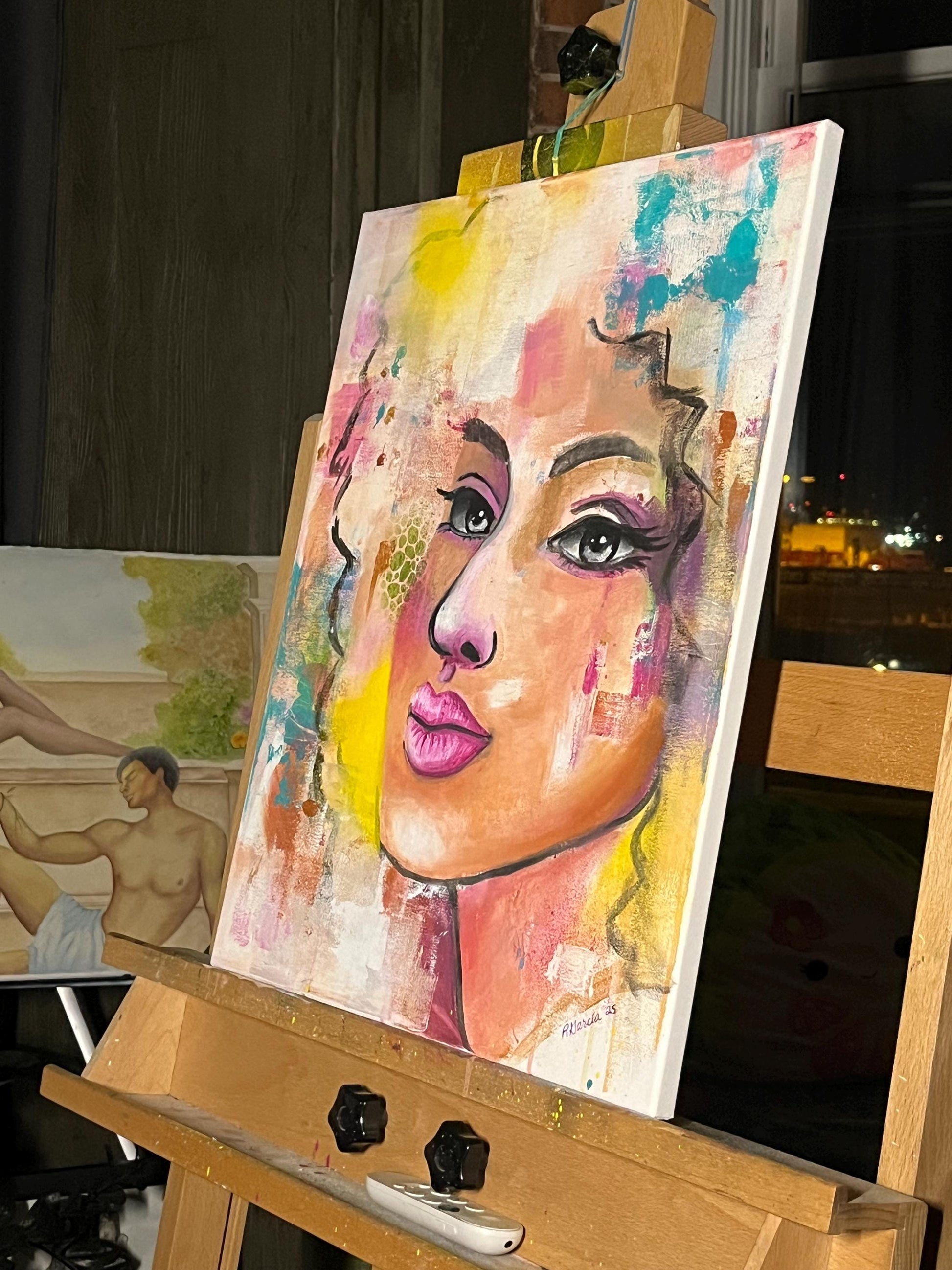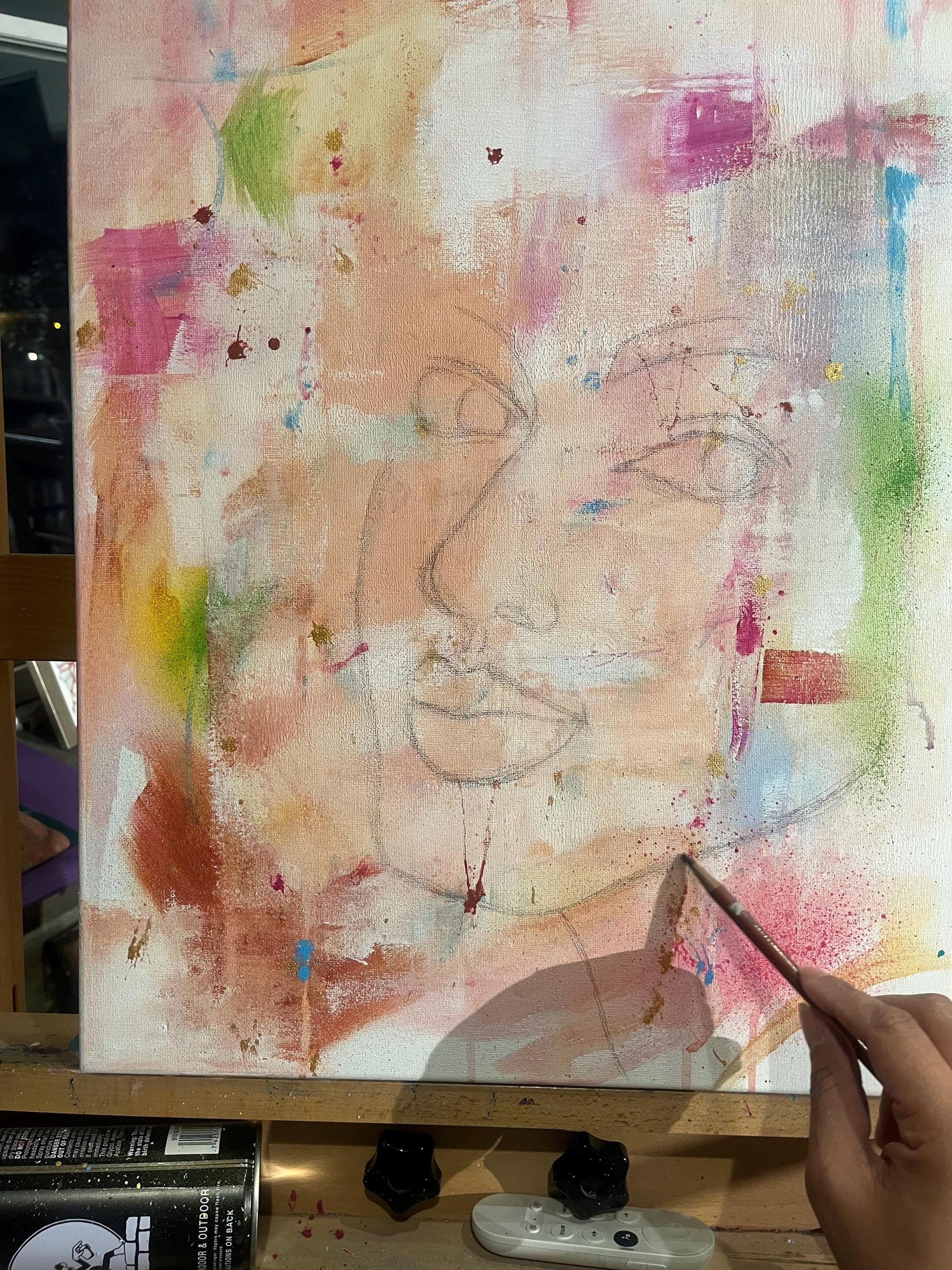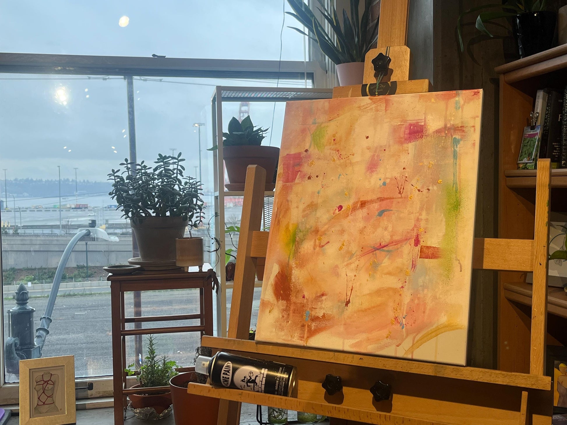 Hand-made 16x20 mixed media painting, using acrylic, charcoal, and spray paint on stretched canvas. Using rollers, brushes, spray paints and the palette knife, and even my fingers, made creating this piece such a joy, which I hope will shine through and add some lightness to your space!