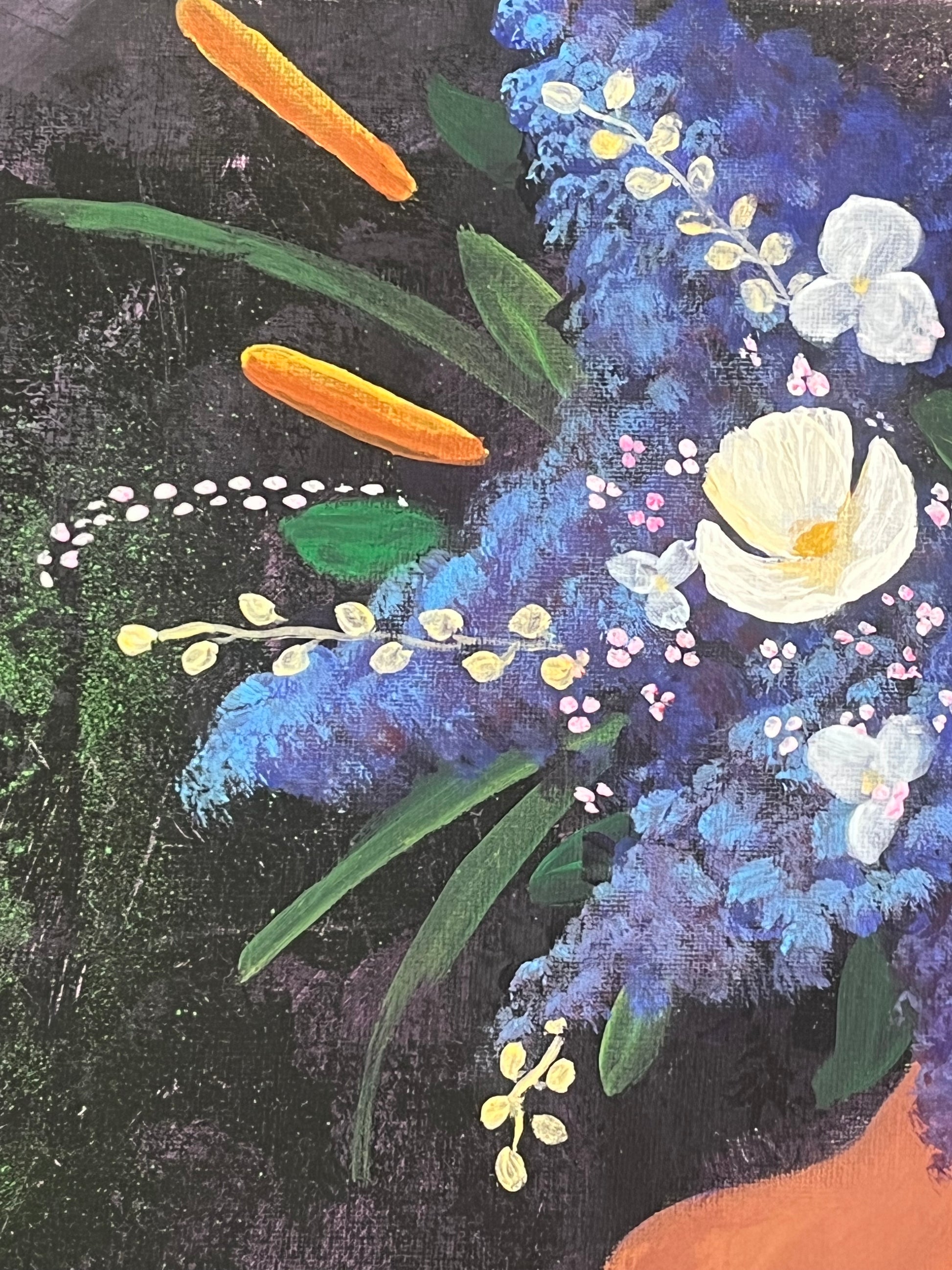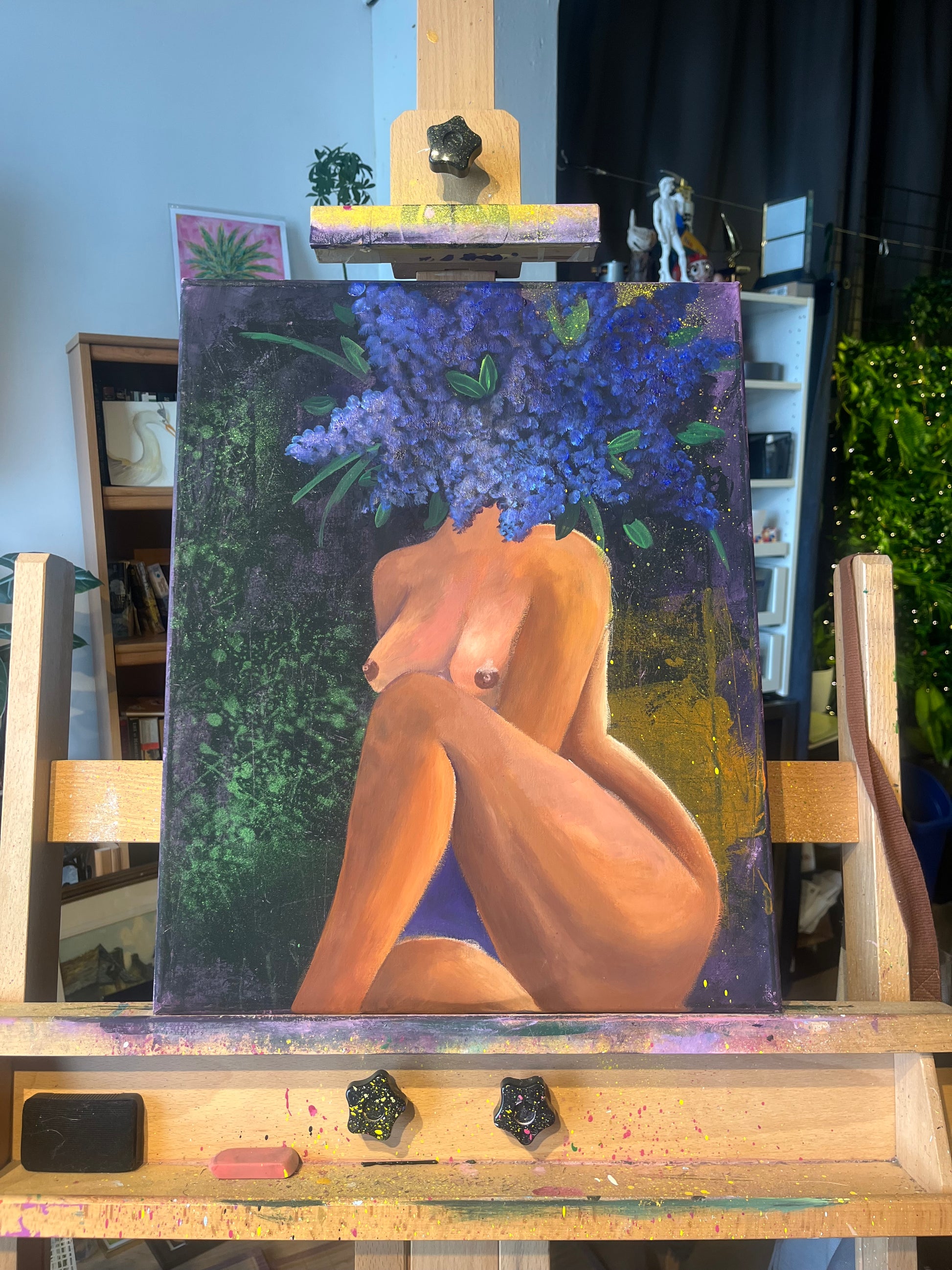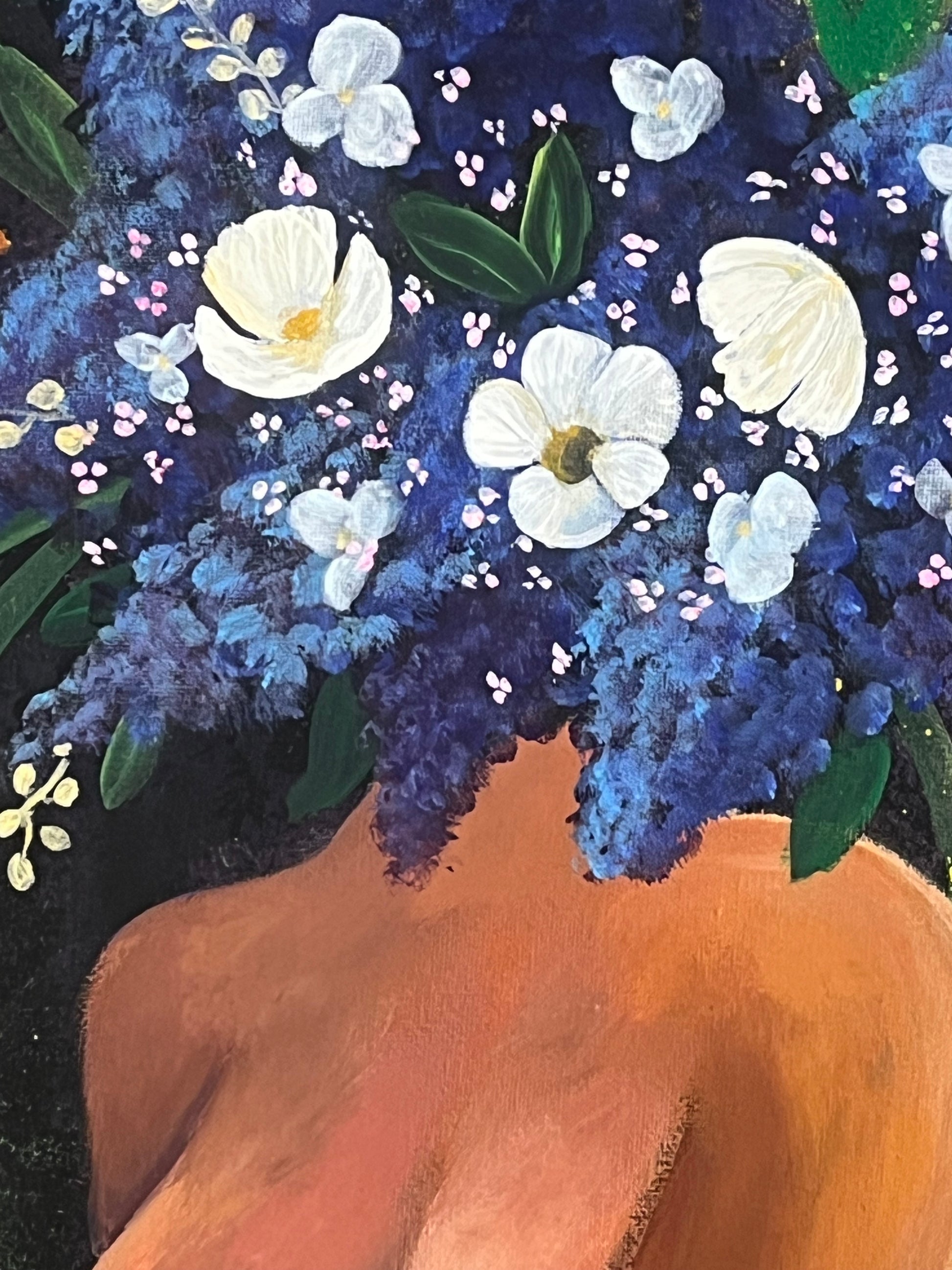 I celebrate feminine curves and floral beauty on a backdrop of muted chaos. While I find the process of creating my abstract backgrounds to be incredibly freeing, it is balanced by the meticulous rendering of the figure and flowers. It is a lovely mix of wild and spontaneous gestures, and careful, methodical strokes.