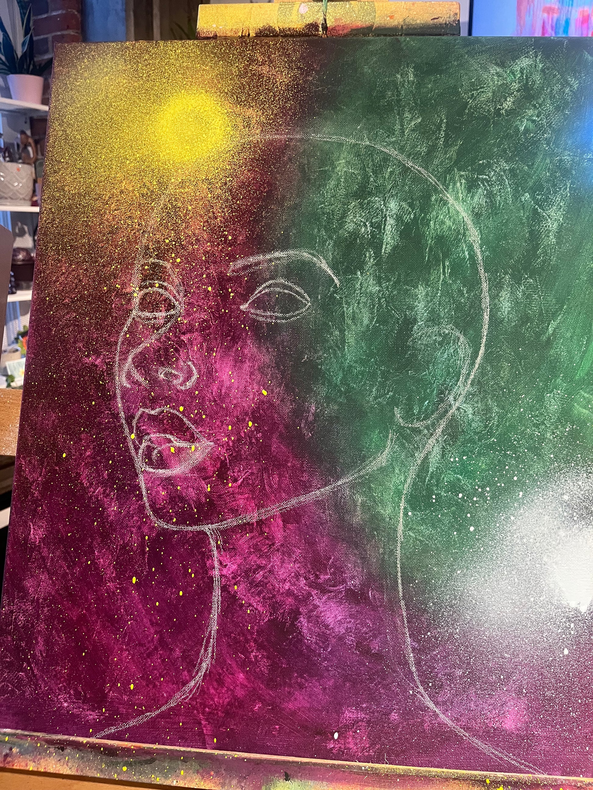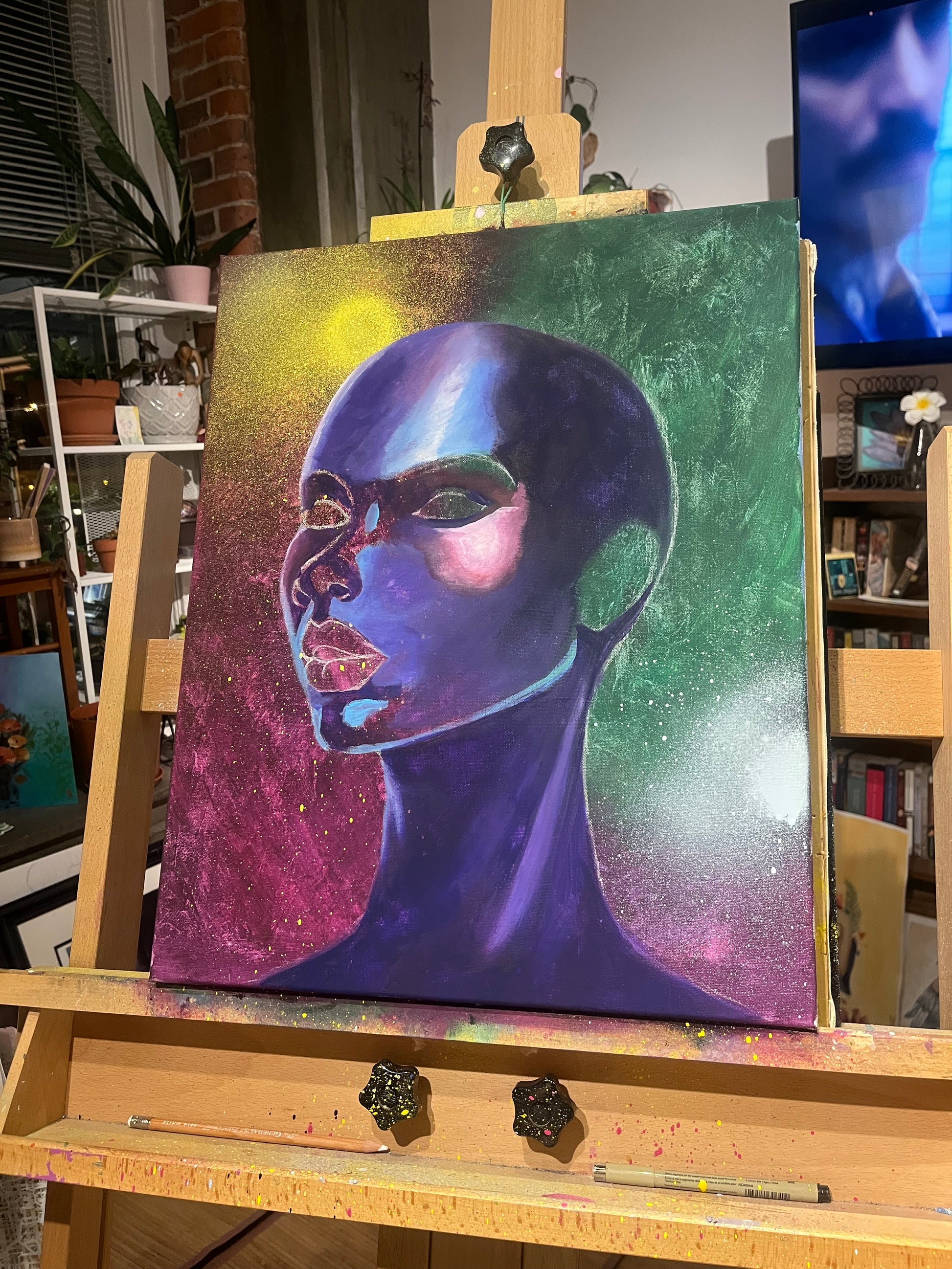 I loved beginning with the chaos of random colors and spray paint, much like the chaos of space, and drawing, little by little, Nephthys- protector, warrior, ruler of the air, goddess: past, present, future.