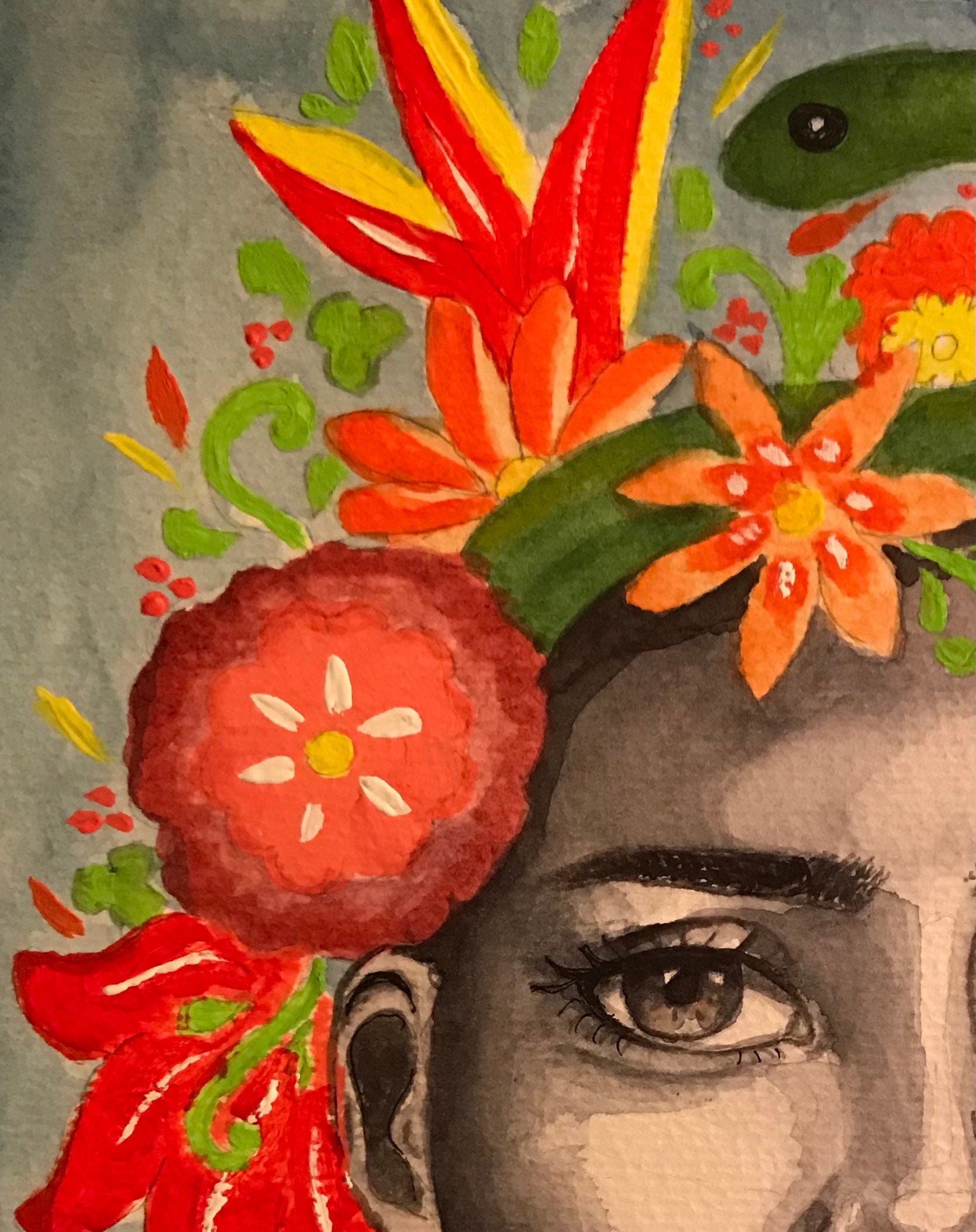 Exploring my Mexican heritage and continuing to discover the planes, shadows, and expressions in faces. The connection between snakes and earth and the female power of creation is something that I wanted to delve into and so, with that in mind, Serpiente y Flores emerged.