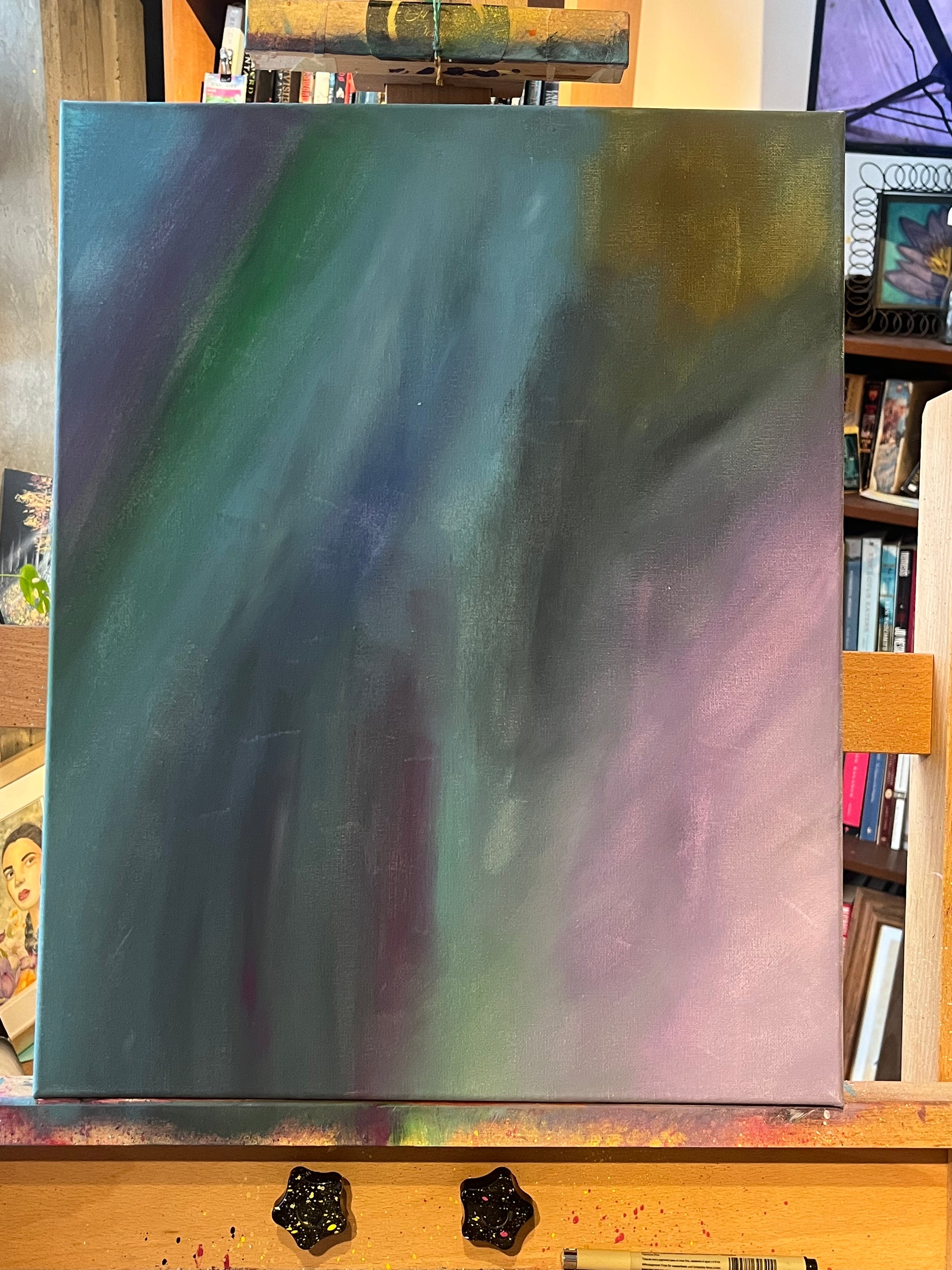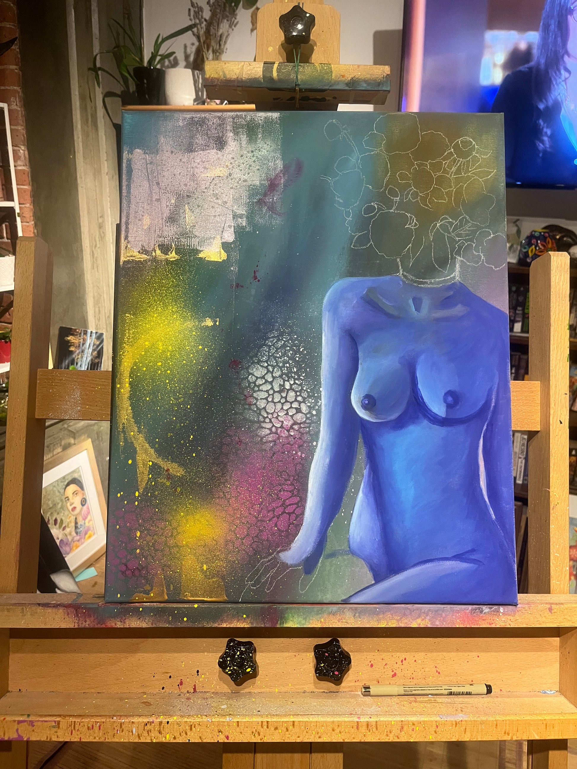 Contemplating the lines and curves of the female figure and wishing for the PNW rain to turn to sunshine and blooms. I really had fun playing with textures, patterns, spray paint, and palette knives and teasing the flowers onto the pensive head of this figure. I can't wait to get to the next canvas and see what awaits there.