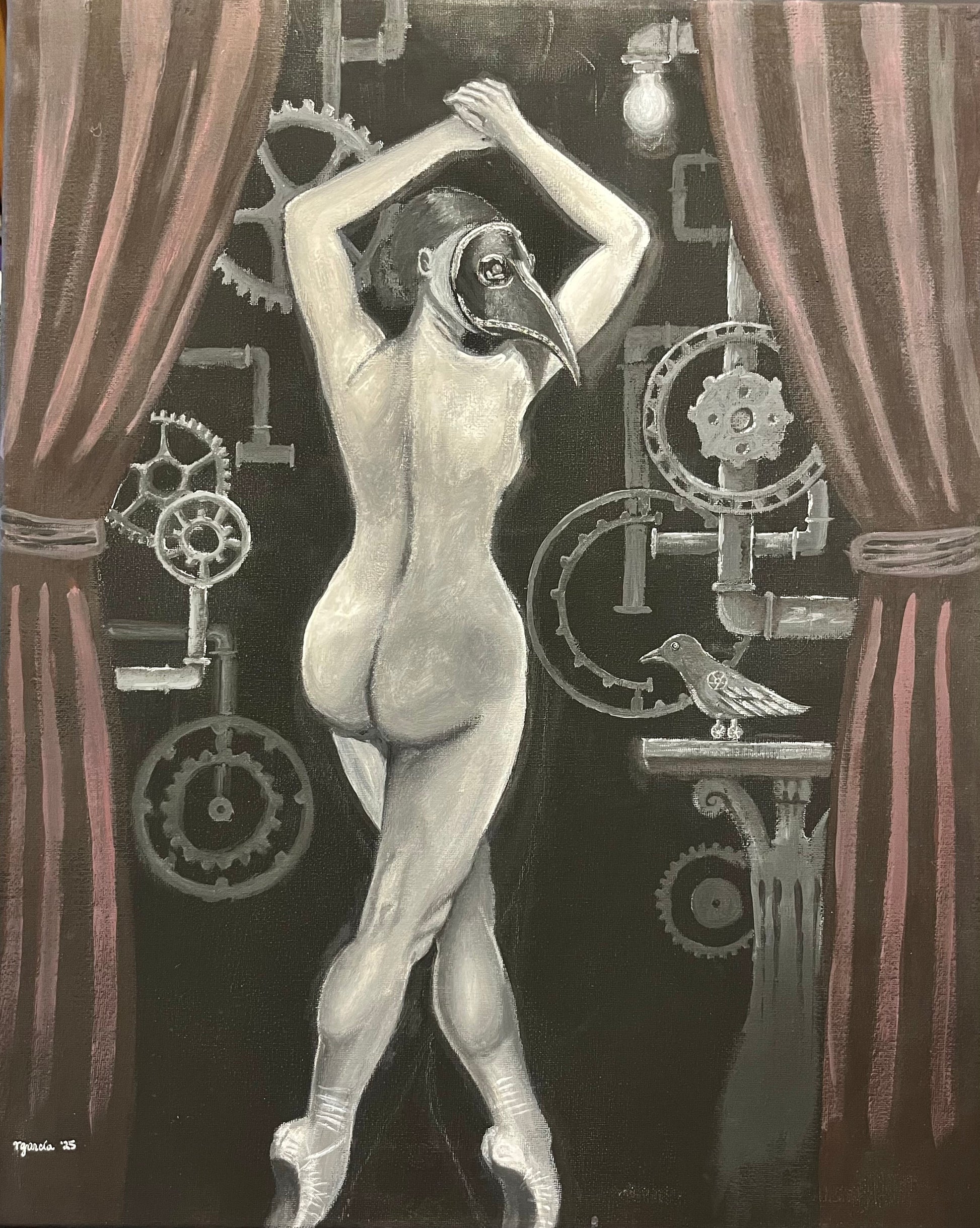 Draw back the curtain and witness the delightful dance of a masked muse. Her eyes beckon behind her mask as she glides in and out of the shadows. Around her churn the industrial cogs and wheels and mechanical wonders. Will you accept her invitation..?